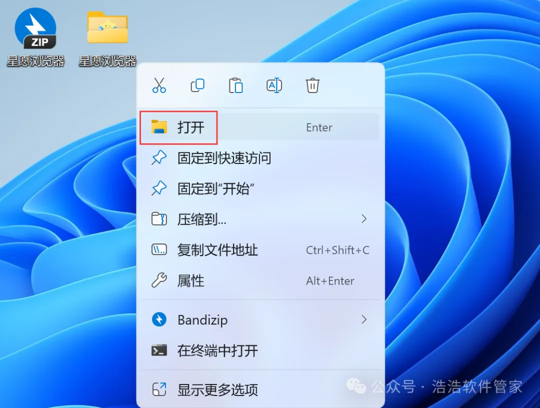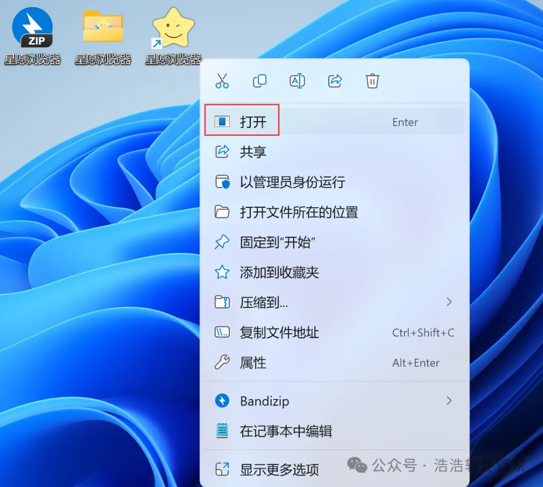 6、回到桌面,右键桌面上的【星愿浏览器软件图标】,点击【打开】