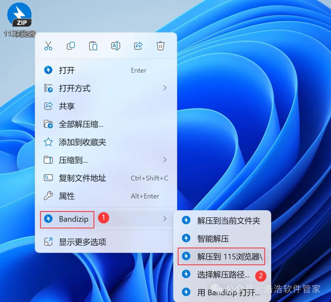 1、下载115浏览器软件安装包到电脑上,右键选择【解压到115浏览器\】