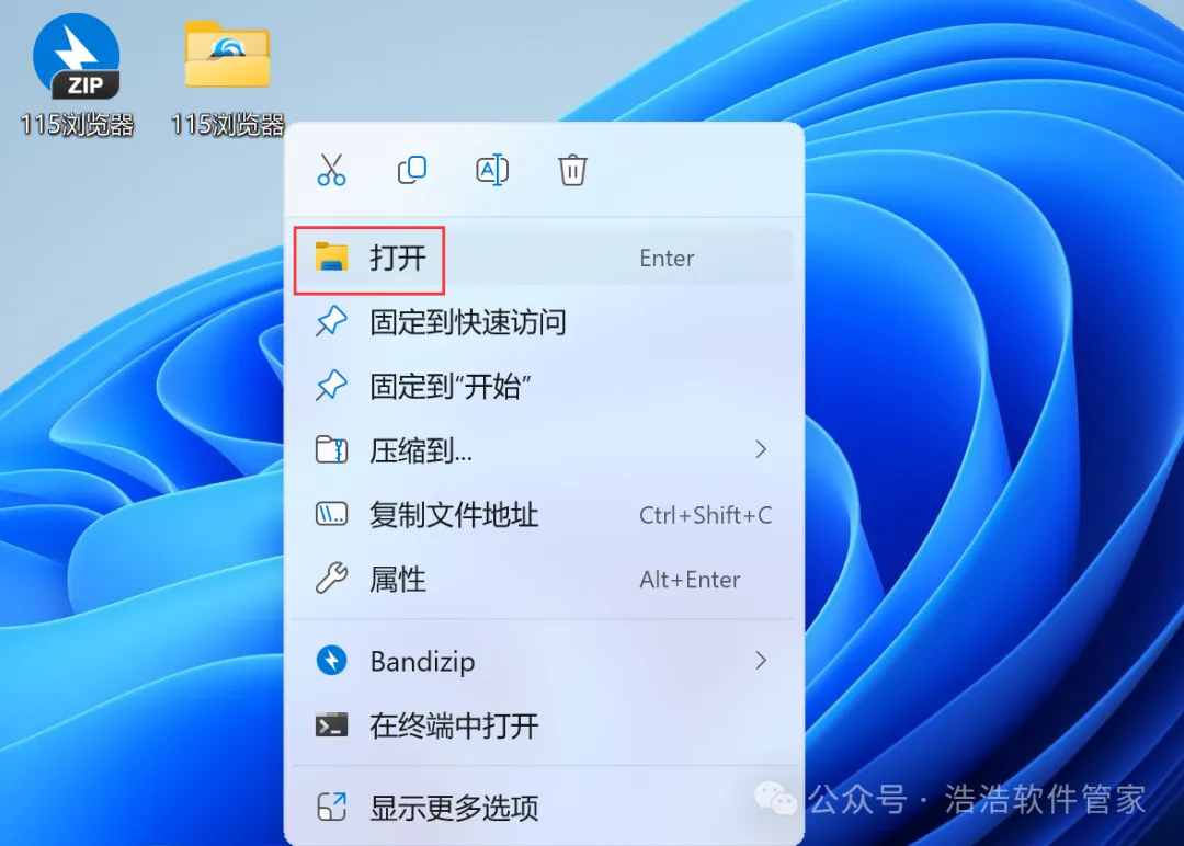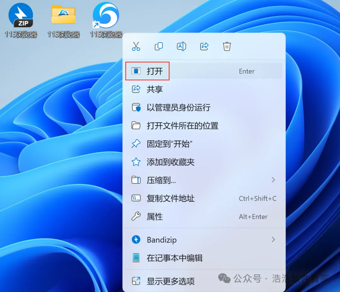 7、回到桌面,右键桌面上的【115浏览器软件图标】,点击【打开】