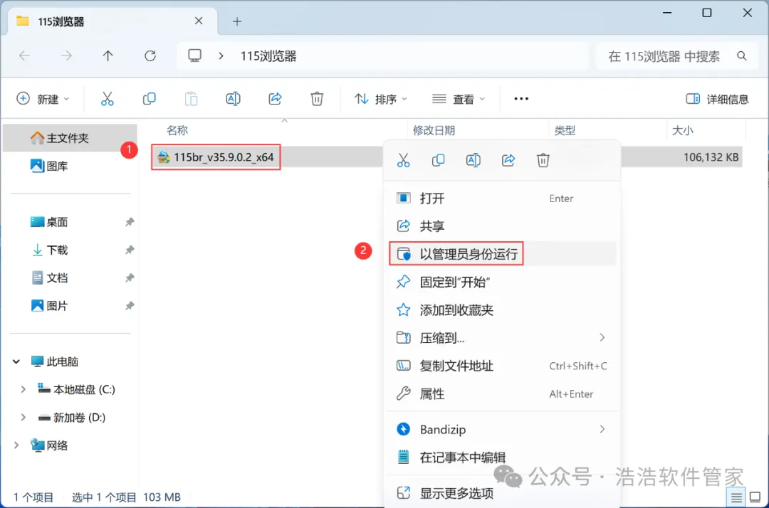 3、找到【115浏览器】应用程序,右键选择【以管理员身份运行】它