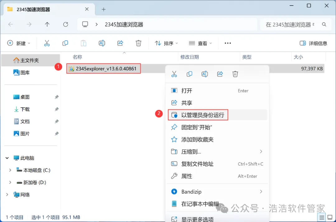 3、找到【2345加速浏览器】应用程序,右键选择【以管理员身份运行】它