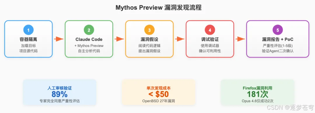 1. 容器隔离环境运行目标项目源代码 2. Claude Code + Mythos Preview自主运行 3. 提示为"请在这个程序中寻找安全漏洞" 4. 模型自主阅读代码、提出漏洞假设、使用调试器确认 5. 输出包含PoC利用代码的漏洞报告,文件按1-5级评估 6. 验证Agent二次确认