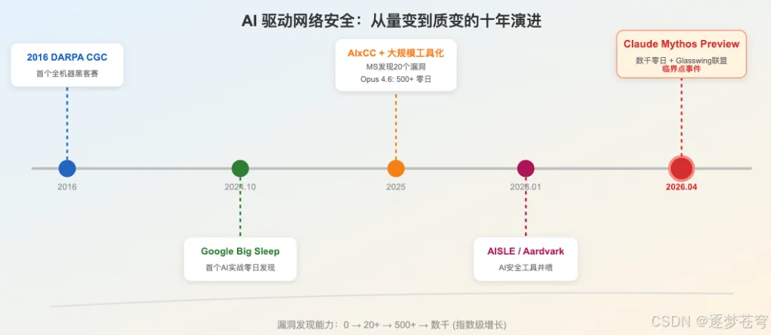 Project Glasswing和Claude Mythos Preview的发布不仅仅是一次产品发布——它是AI网络安全从量变到质变的临界点事件。从DARPA CGC 2016年的机器首次参赛到2026年的数千零日自主发现,这十年的演进曲线呈现出明显的指数特征。