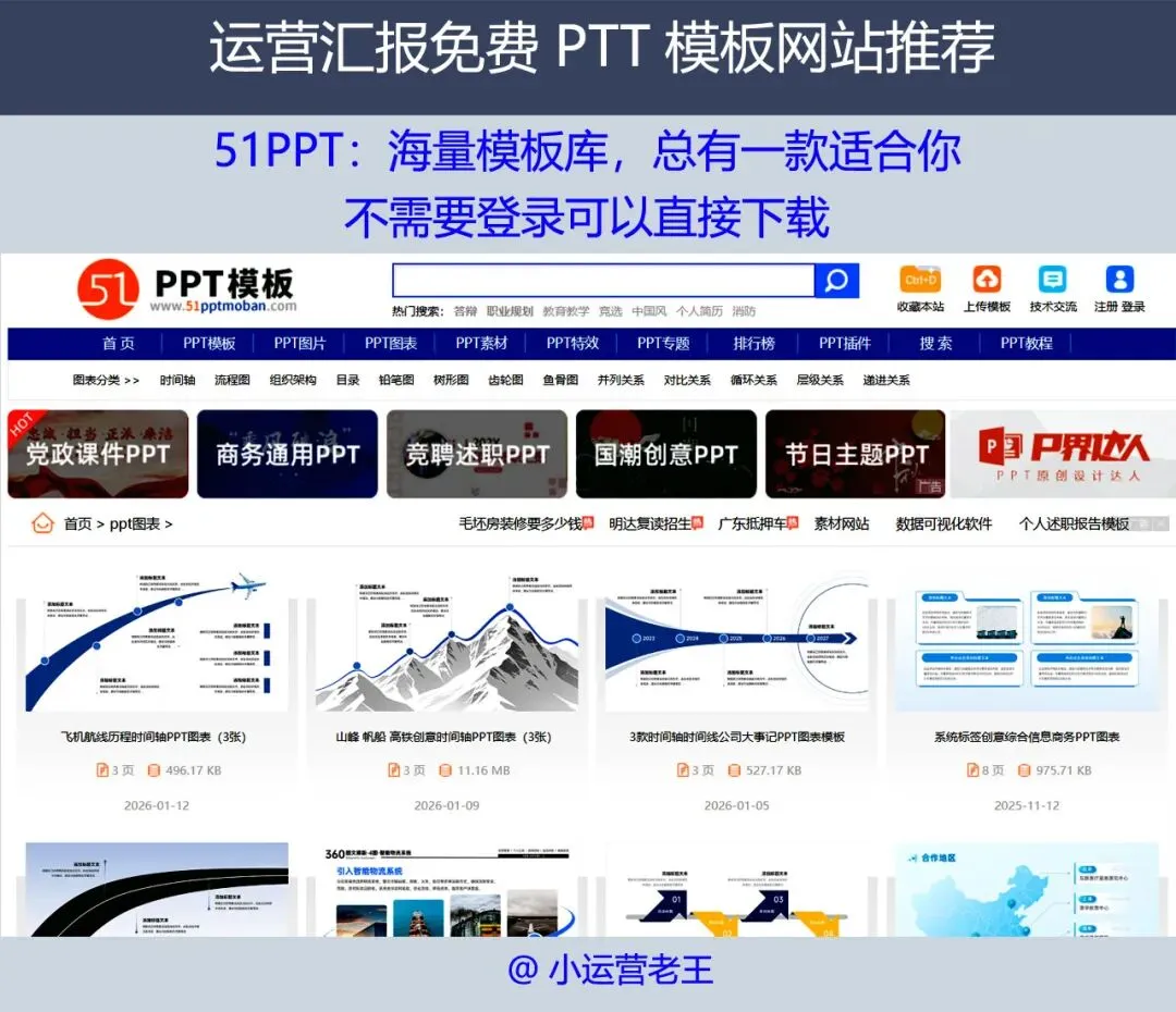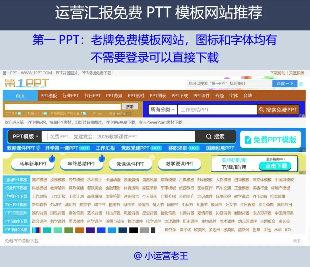推荐理由: 这是一个老牌到不能再老的PPT资源站,已经稳定运行近15年了。它的核心理念是 “让每个人都能用上好模板” ,所有模板全部免费下载,无需注册、无需积分。模板种类极其丰富,课件、节日、答辩、商务、党政……覆盖了你能想到的所有场景。虽然部分模板的设计感可能没那么新潮,但胜在内容结构扎实,尤其适合做逻辑性强的汇报PPT。