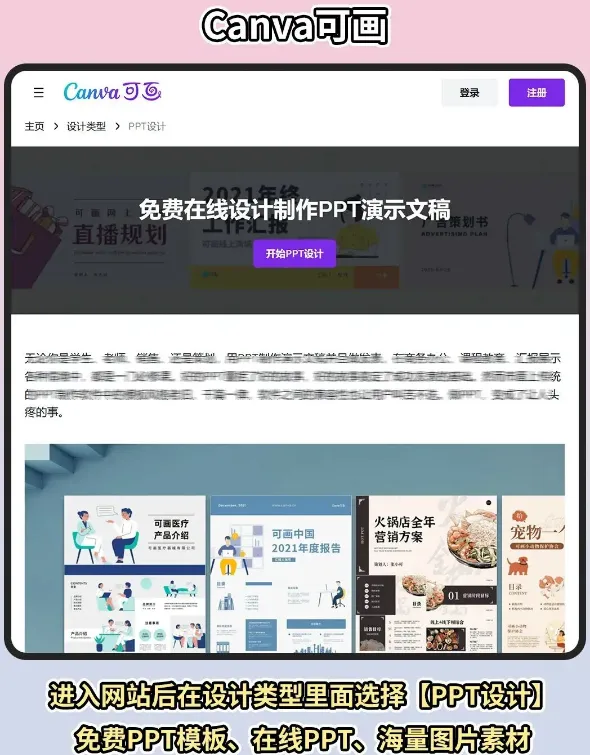 推荐理由: Canva不仅仅是在线设计工具,它的PPT模板也非常强大。采用拖拽式操作,模板种类多、风格美观,涵盖汇报、海报、简历等场景,自带海量图标、图片素材,拖拖拽拽就能改。免费版足够日常使用,适合不太熟悉PPT软件、想要快速出效果的用户。部分模板会有“Canva水印”,手动删除即可,不影响整体使用。