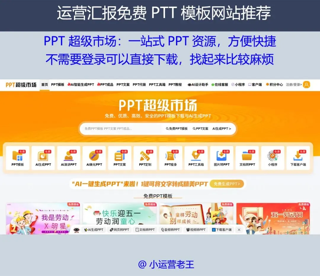 别急!为了不让大家踩坑,我整理了一份运营人私藏的7个免费PPT模板工具网站。保证真免费、不套路,各种风格都有,帮你省下80%的设计时间,让大家快乐下班!