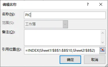 3、定义名称:CTRL+F3新建名称 PIC,引用位置:=INDEX(Sheet1!$B$1:$B$10,Sheet2!$B$2)函数解析:Sheet2!$B$2用来提供行号,表示从$B$1:$B$10中取第几行的值