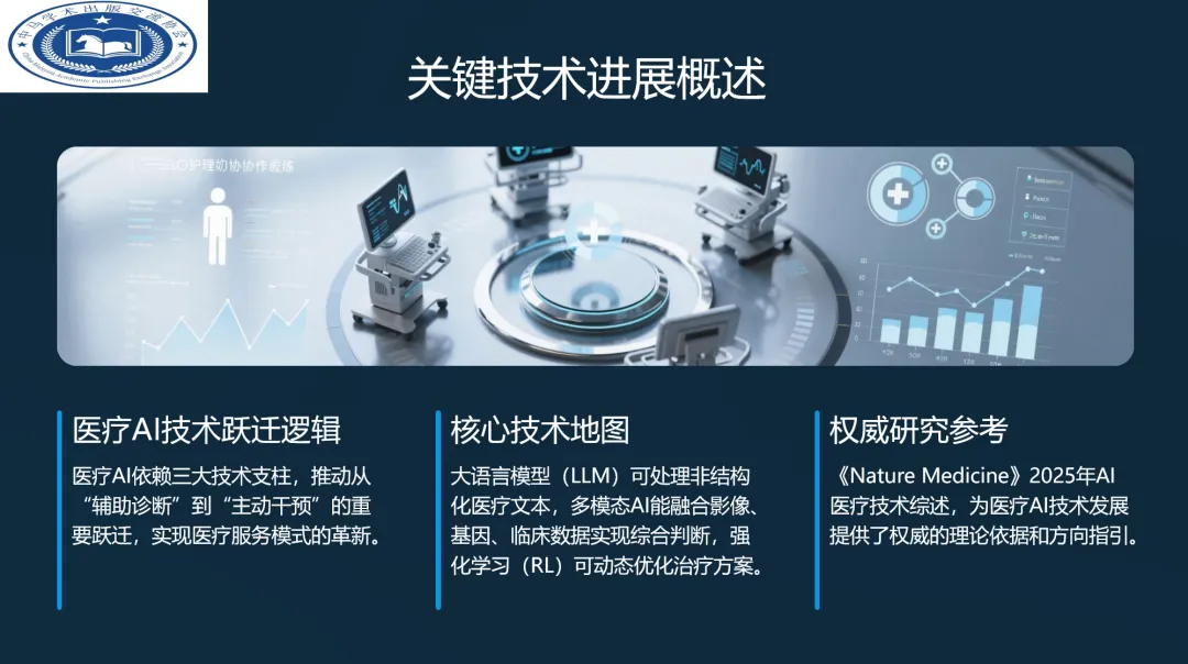 AI医疗依赖于大语言模型(LLM)处理非结构化文本(如电子病历)、多模态AI融合影像/基因/临床数据进行综合判断、强化学习(RL)优化个性化治疗方案三大技术支柱,推动医疗服务模式革新。