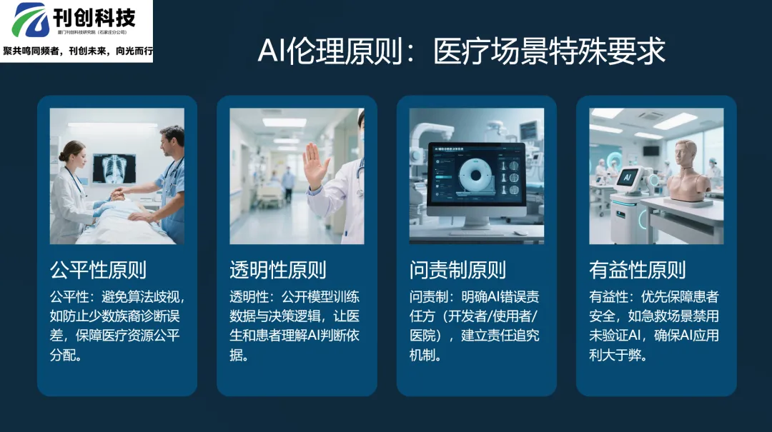◦ 伦理挑战:包括算法偏见(如皮肤癌诊断算法对深色皮肤误诊率高)、可解释性、责任界定(如手术机器人事故责任方)以及数据隐私。