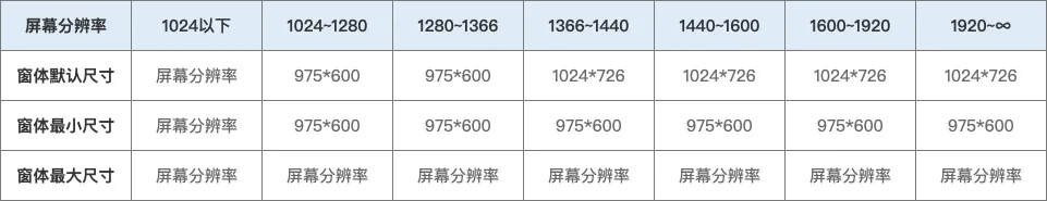 下面我们以钉钉PC客户端为例,来解析它的适配方案,以便我们设计师能主动地把控产品在各种设备上的良好体验。响应式布局的本质是通过识别用户设备屏幕的尺寸环境,选择最佳的内容展示方式,让页面有能力在所有设备环境中保持良好的用户体验。因此,制定适配方案的第一步,就是先确定产品适用的屏幕尺寸区间。320~1920基本上是所有设备屏幕宽度的尺寸范围,320、360、480、768、1024、1280、1366、1440、1600、1920这些尺寸是各设备中占比较多的屏幕宽度。需要根据产品定位收集所有用户设备覆盖的尺寸范围及核心用户设备的屏幕尺寸,然后将屏幕尺寸范围根据断点分为几个区间。根据用户使用场景、商业价值、技术及维护成本等因素,一般将PC客户端适用的屏幕尺寸区间定义为:实际在制定适配方案时,区间不会划分这么细,除非页面上有比较复杂的组件,需要一个区间一个区间调整代码以保证观感最佳。如果页面内容较少,布局较简单,只需要考虑1366以下、1366~1920、1920以上3个区间的适配规则即可。接着,需要以页面内容展示的完整性和屏幕空间的利用率为衡量指标来确定每个区间客户端窗体的默认尺寸和最小尺寸。经过测试,钉钉PC客户端在各屏幕尺寸区间的窗体尺寸如下(粗略测量数据可能有偏差):小屏幕上,客户端的窗体大小基本等于屏幕分辨率,也就是窗体最大化后的尺寸。准确来说,窗体最大化后的高度是屏幕分辨率的高度减去系统任务栏的高度。在制定窗体默认尺寸和最小尺寸的时候,要注意这一点,不然很可能出现窗体下方被任务栏挡住的情况。另外,测试过程中发现,虽然钉钉对1366以下的屏幕也进行了适配,但也只是保证界面元素不重叠、不错乱,不会再保证内容显示的完整性了。钉钉PC客户端主要使用了两个窗体临界值,1024*726和975*600,为什么定义这个尺寸,还无从考证,有兴趣的朋友可以一起探讨下。在制定我们自己的适配方案时,如果找不到计算窗体大小的理论依据,可以借鉴钉钉PC客户端的这套规则,当然也可以根据自身产品特性进行窗体默认尺寸和最小尺寸的调整。比如说如果把最小高度设成620,刚好能让侧边栏菜单完全显示处理,那设成620就是合理的。只要适配出来的效果好,就是正确的规则。确定好窗体尺寸的适配规则后,接着要确定当前页面内容区域的适配规则。1.保持内容区域两侧与窗体边缘的留白宽度不变,内容区域随着窗体伸缩而伸缩。此种适配规则适合工作台、管理后台,因为内容区域随窗体拉伸而变大,可以在界面上看到更多信息,提高多任务多线程操作的工作效率。2.两侧留白宽度随着窗体大小改变,内容区域保持固定宽度。此种适配规则的选用更多是为了用最低成本实现跨终端全尺寸设备兼容。3.混合式。从下图图可以看出,钉钉PC客户端同一个页面的适配规则并不是单一的。在一定窗体尺寸范围内,内容区域跟随窗体拉伸,边距几乎保持不变或成比例变化,当窗体大小超过了某个尺寸之后,内容区域宽度开始保持固定,边距开始变大。
