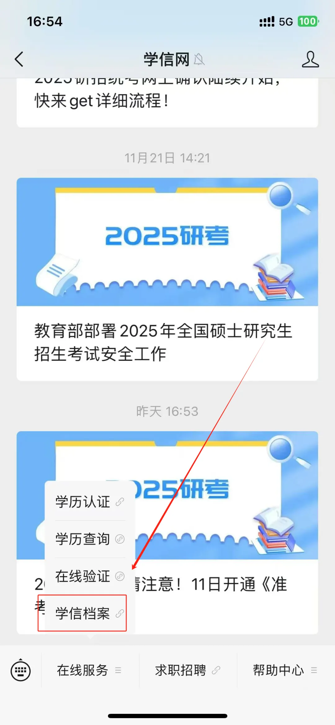✅点击在线服务——菜单栏——选择学信档案——点击登陆,注意:同样需要进行输入毕业证书编号登录。