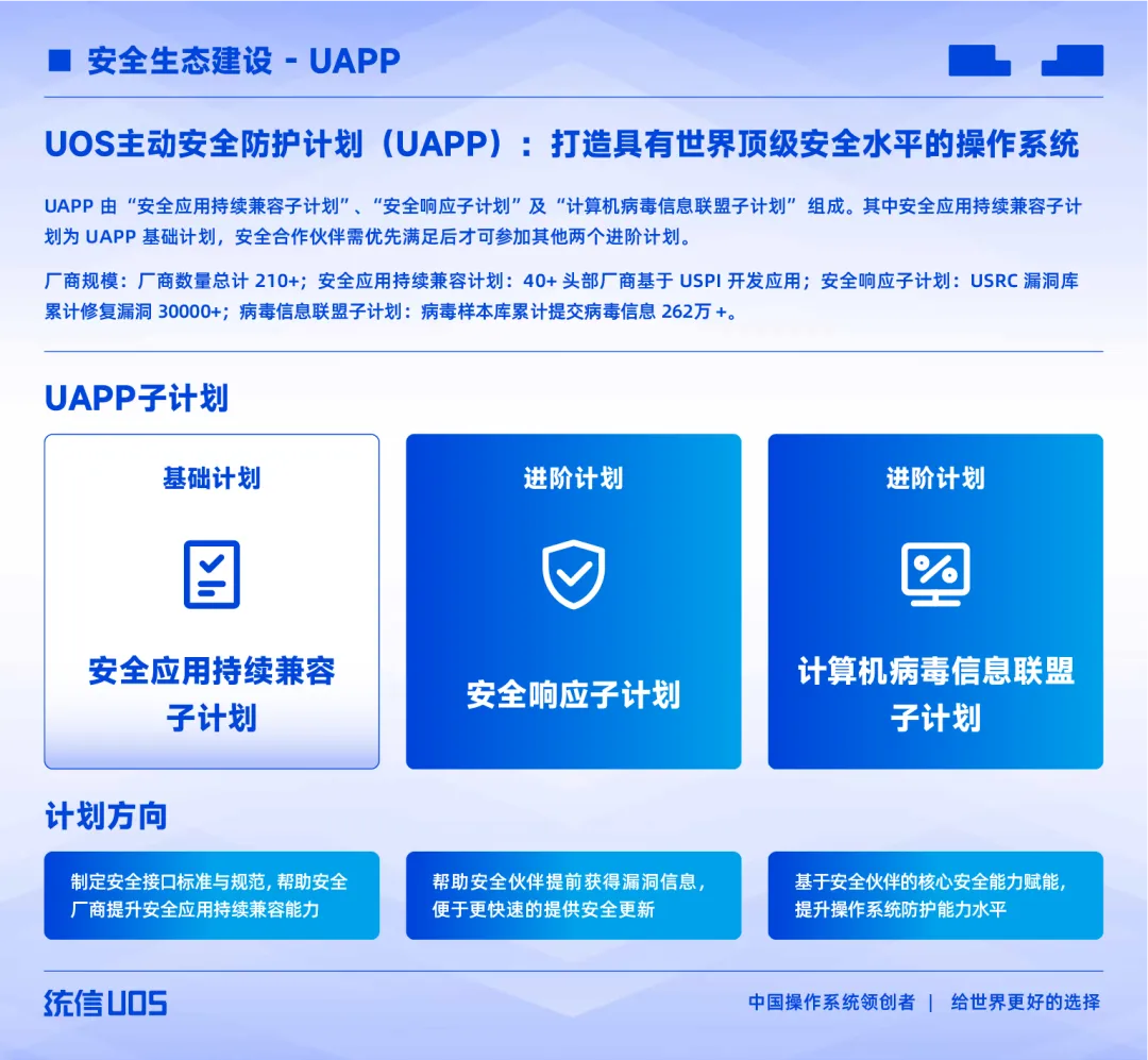 UAPP 主动安全防护计划如同一张巨大的安全网络,目前已接入 210 余家头部安全厂商,覆盖 TOP 榜单 85% 的头部企业。从病毒样本共享到漏洞协同治理,统信软件与生态伙伴实现了情报的无缝对接。