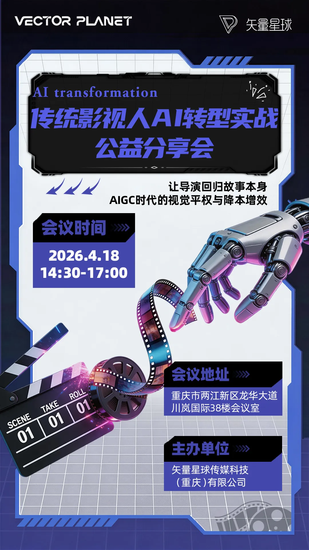 本次分享会由矢量星球传媒科技(重庆)有限公司主办。公司于2023年成立,是国内布局AIGC领域的先行者之一。核心团队融合“算法工程”与“影视创意”双重基因,专注生成式AI技术研发及在多端影视、广告行业的垂直应用,秉持“艺术、质量、内容”的核心主张,独创“影视价值落地中台”打通AI影视创作全流程闭环。