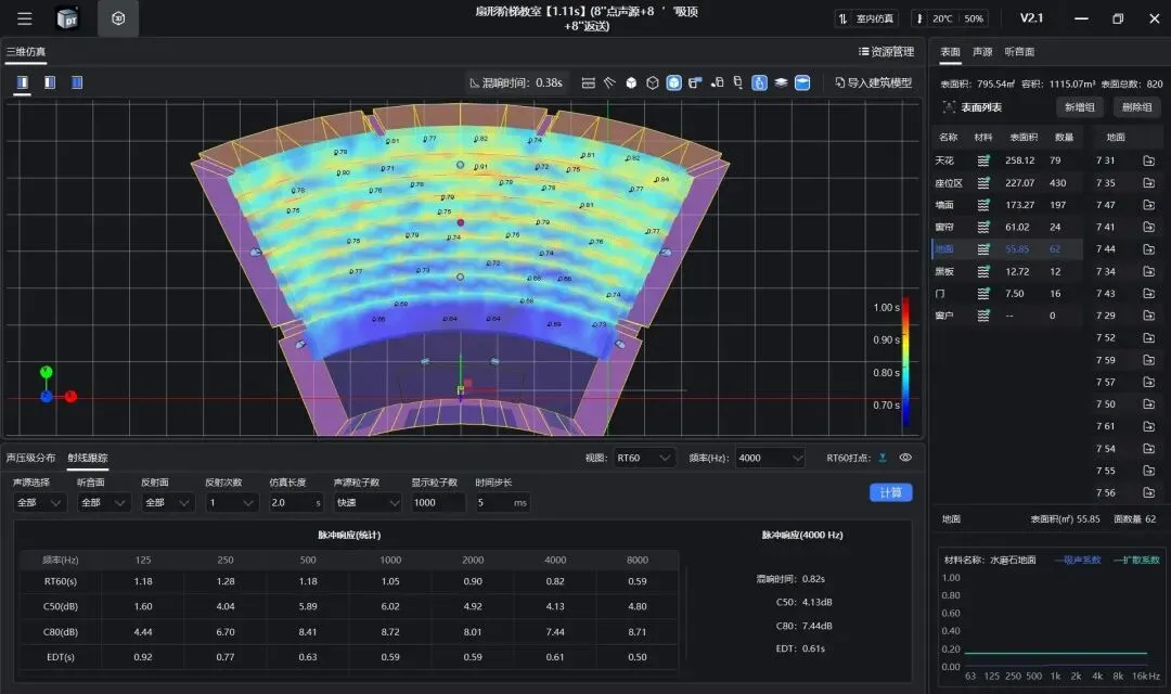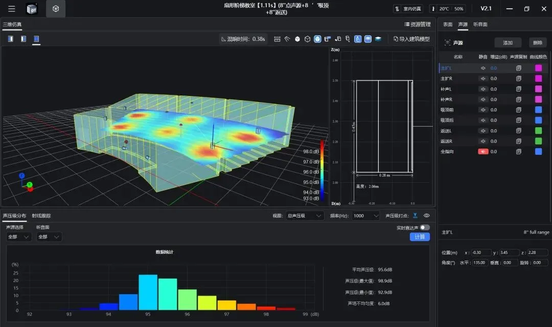 DT-S面向声学设计、模拟和系统方案阶段,更聚焦前期声场预测与仿真分析,可围绕混响时间、STI、C50、C80、扬声器覆盖、声压级分布、声场不均匀度等关键指标,为方案设计、系统配置与前期论证提供更直观的参考。相比单纯依赖经验判断,这种方式能够帮助用户更早看到方案效果,也让方案比较和技术沟通更有依据。