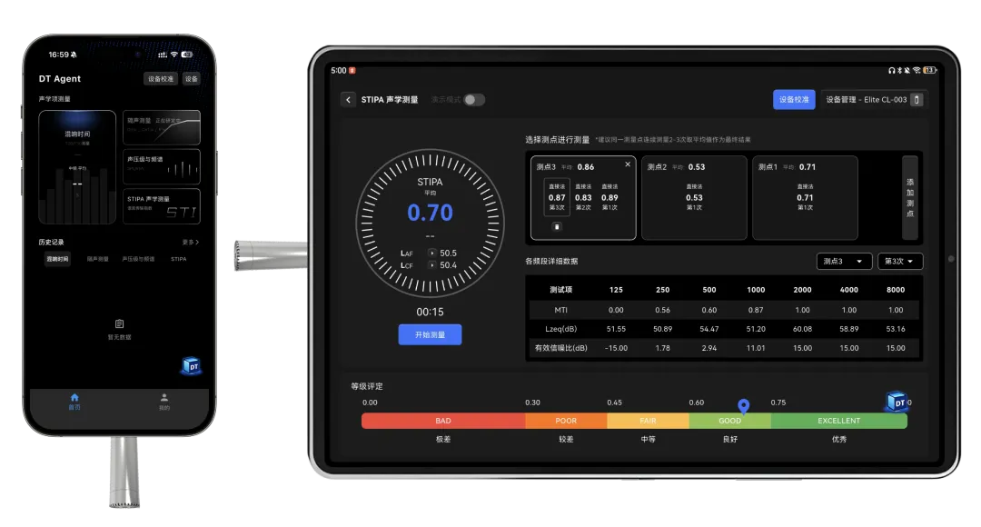 在方案阶段之外,DT Agent APP 可为现场测量与调试提供辅助支持。作为一款移动端声学测量软件,DT Agent 可搭配外置测量传声器完成 SPL、RT60、STIPA、隔声等多种测量。同时内置智能体,可在现场测量、分析判断与调试过程中提供更高效的辅助支持。