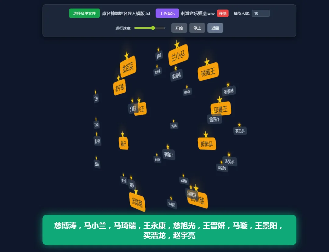 启用「星空点名」工具,全班学生姓名化作璀璨星空中的点点繁星,系统随机滚动抽取,如同趣味抽奖。点名时自动语音播报姓名,支持自定义班级合照、学科主题等背景画面,可直接适配希沃白板、鸿合一体机投屏使用,操作便捷、画面生动。