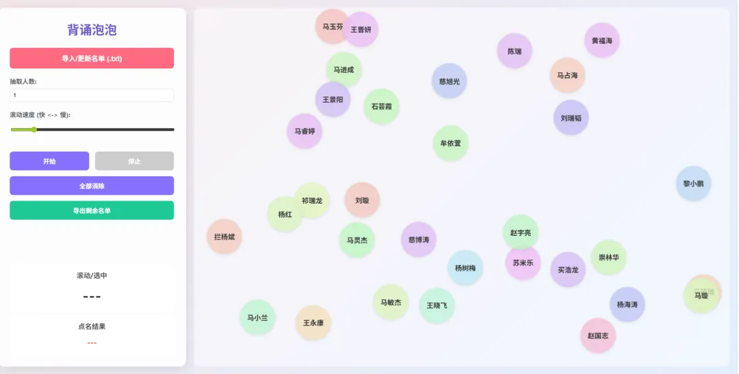 导入班级学生信息,为每位学生生成专属彩色任务泡泡。学生完成背书、默写、作业等任务后,点击大屏即可让对应泡泡“爆破”,系统自动提示完成。未完成名单支持一键导出,便于教师针对性跟进辅导,不漏掉任何一位学生。