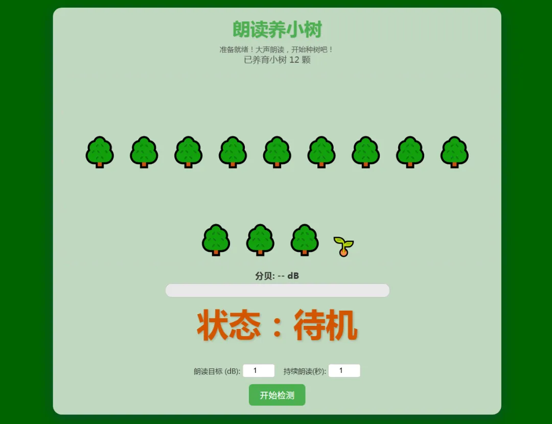 使用「朗读养小树」工具,设定合理音量阈值,学生朗读达标即可触发屏幕小树生长,多棵树苗可合成大树,声音越洪亮、持续时间越长,绿植景观越茂盛。大屏实时展示班级“朗读森林”,直观呈现整体状态。