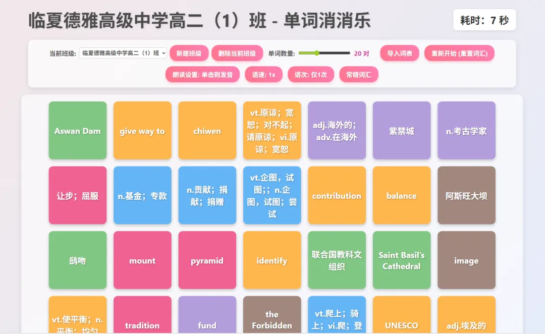 「单词消消乐」将单词学习转化为方块消除游戏,配备跟读功能,听读结合、学玩同步;支持分班级建立词库,自动记录易错单词,开展针对性强化练习。