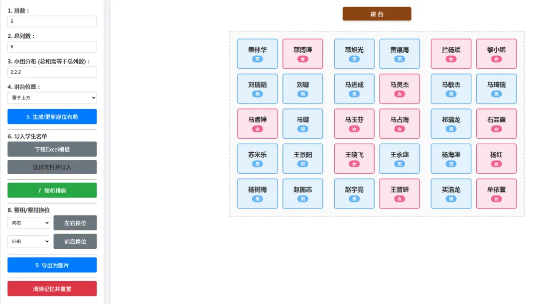 自定义教室排数、列数与讲台方向,导入学生名单即可一键自动排座;支持拖拽自由调整,可设置身高适配、强弱搭配等优化规则,完成后直接打印张贴,全程不超过10分钟。