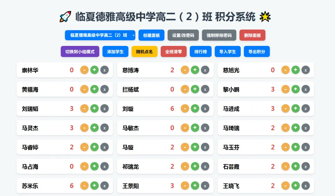 导入学生信息后,可实时进行加减分操作,支持分组加分、自动生成排行榜,配备密码锁防止误操作。所有积分数据自动留存,期末汇总一键导出,清晰规范、便捷高效。