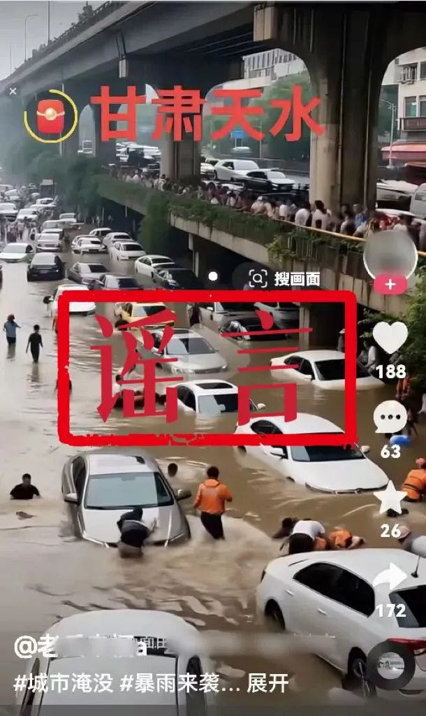 经查,网民张某为博取眼球、吸引流量,利用AI编造发布了“天水城市被淹”的虚假信息,造成了不良社会影响。到案后,张某对其造谣传谣的违法事实供认不讳,并深刻认识到错误。