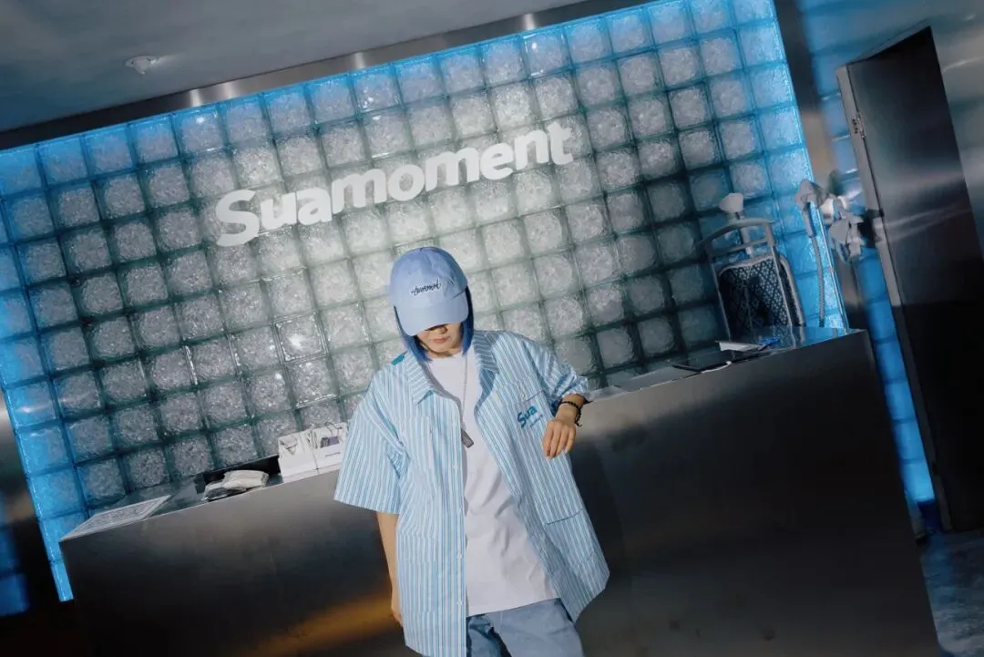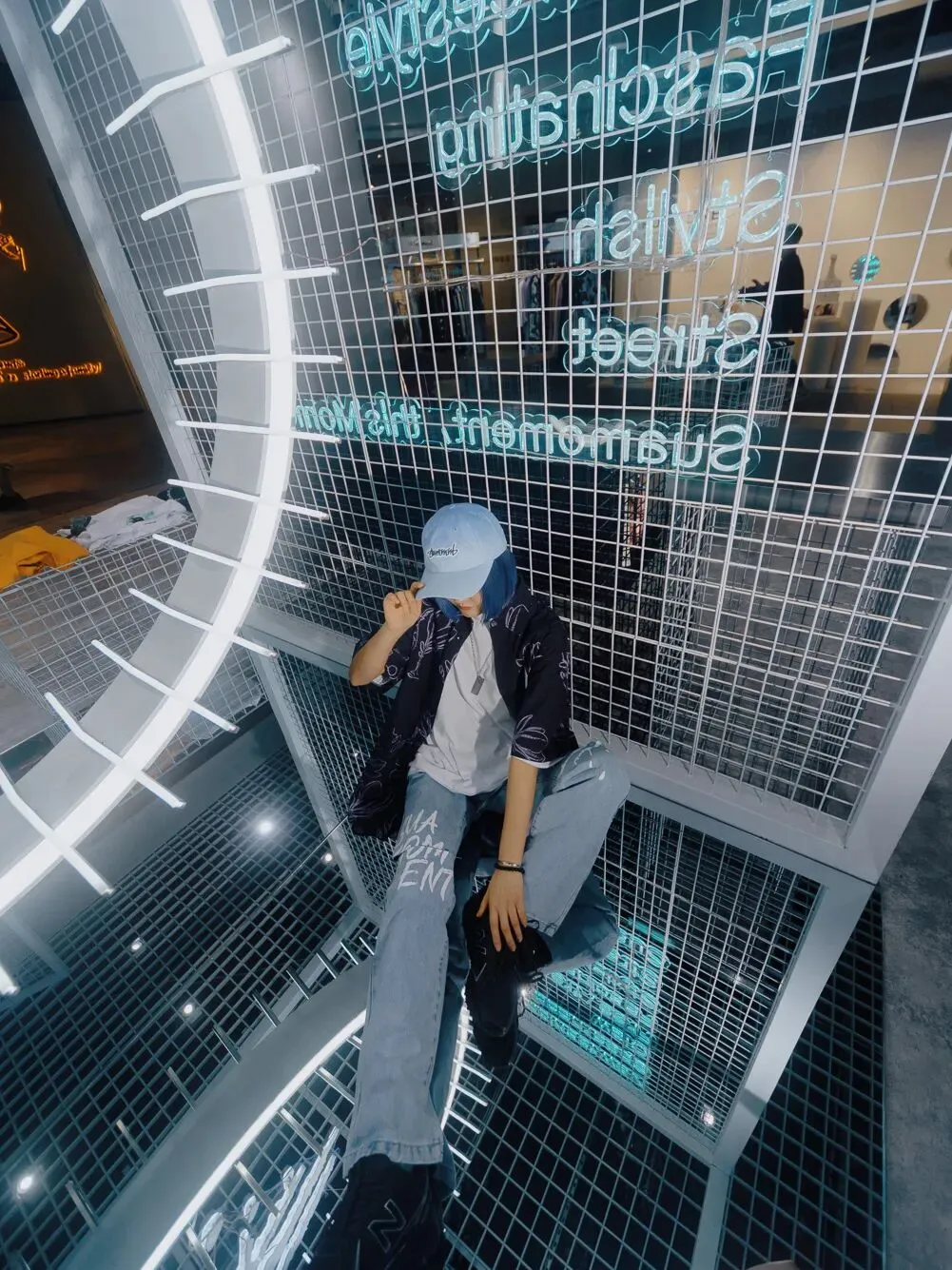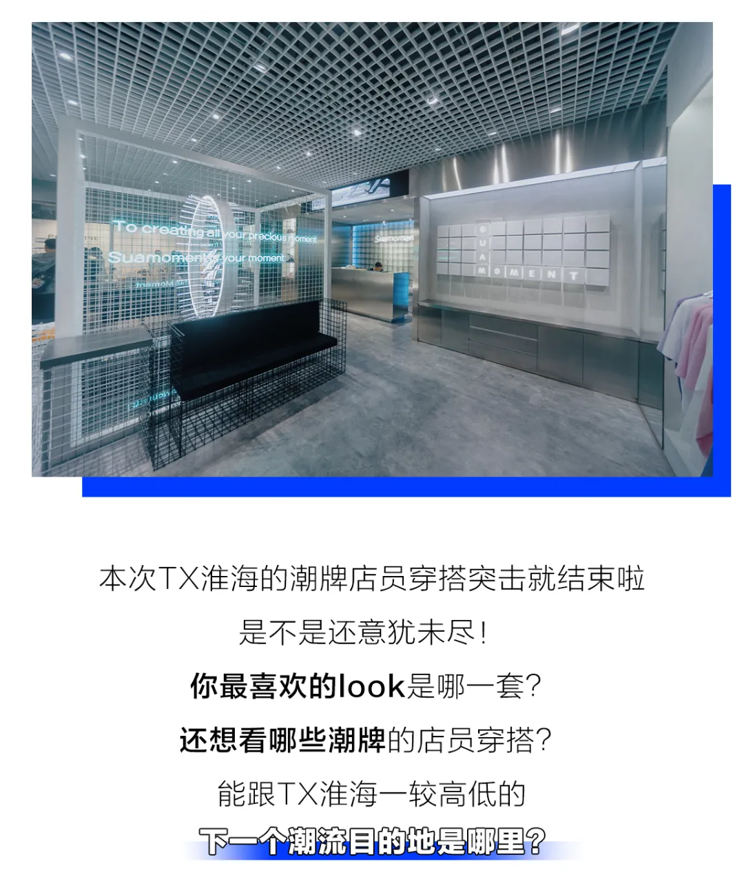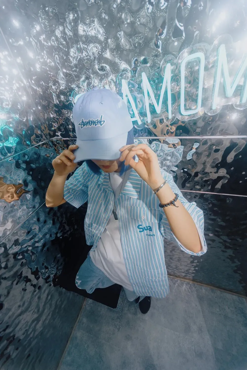 Q:为大家介绍一下今天的Look吧!A:天气渐渐热起来,想搭一套比较清爽的穿搭。帽子、衬衫和裤子都是清凉的浅蓝色,白色内搭的加入增加层次的同时,中和掉同系色块堆积造成的视觉疲劳感。牛仔裤上的破洞和白色涂鸦则透露出不羁和活力。 Q:请用几个词简单形容一下品牌风格A:SUAMOMENT中文名是血爪痕,从logo和店铺陈列就可以看出,我们的品牌调性是偏冷酷锋利和去性别化的。单品设计上,我们也会更多采用简洁的设计和大胆的剪裁,毕竟less is more嘛!Q:店内装修得也太好拍了,最出片的spot在哪里?A:首先当然是店铺C位的logo墙啦,镜面地板的设计坐下来拍你就是超模!还有一个大家容易忽略的地方其实是试衣间,试着试着就可以开始蹦迪!Q:工作中最开心的事是什么?A:TX淮海几乎都是年轻人来逛,大家的颜值真的很高,最开心的事情,就是可以看到很多美女,有很愉悦的工作环境!Q:店内单品的均价大概是多少呢?A:短袖大概是200元,外套在400-500元左右。