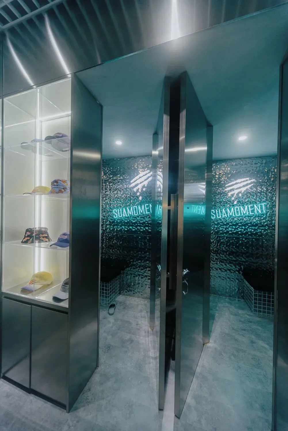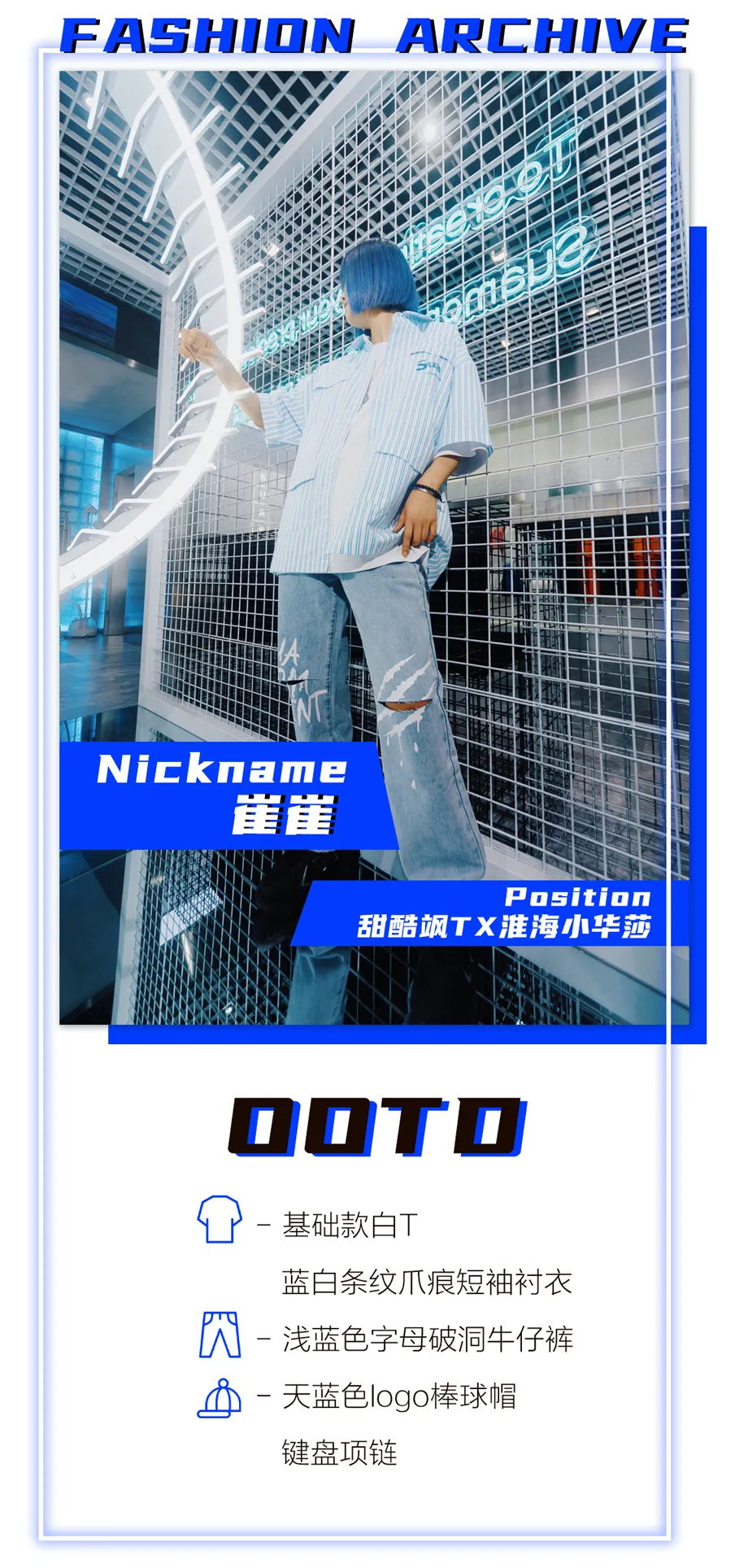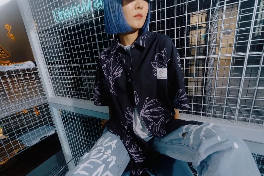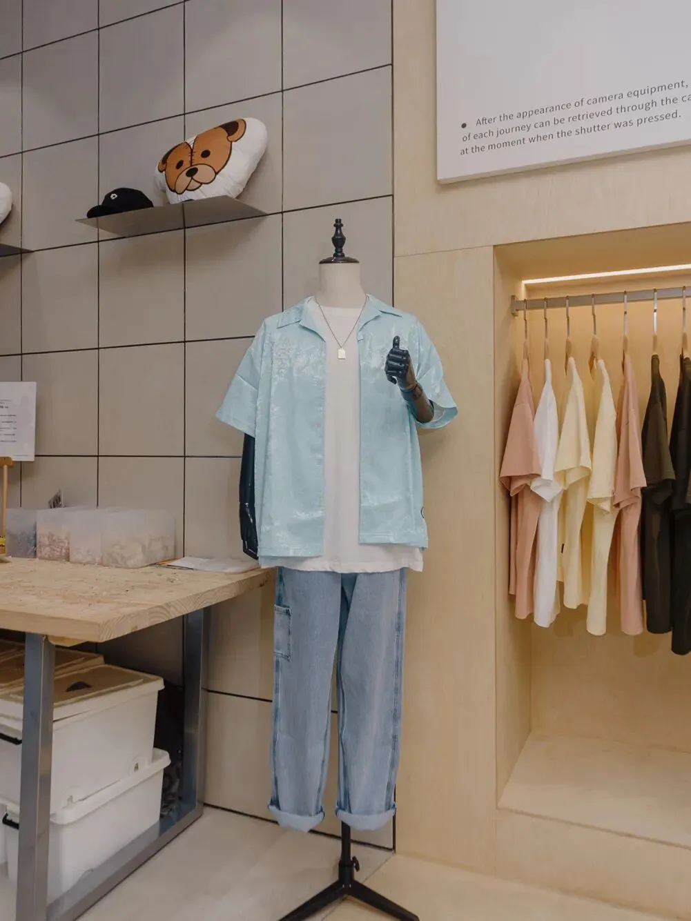 Q:为大家介绍一下今天的Look吧!A:天气渐渐热起来,想搭一套比较清爽的穿搭。帽子、衬衫和裤子都是清凉的浅蓝色,白色内搭的加入增加层次的同时,中和掉同系色块堆积造成的视觉疲劳感。牛仔裤上的破洞和白色涂鸦则透露出不羁和活力。 Q:请用几个词简单形容一下品牌风格A:SUAMOMENT中文名是血爪痕,从logo和店铺陈列就可以看出,我们的品牌调性是偏冷酷锋利和去性别化的。单品设计上,我们也会更多采用简洁的设计和大胆的剪裁,毕竟less is more嘛!Q:店内装修得也太好拍了,最出片的spot在哪里?A:首先当然是店铺C位的logo墙啦,镜面地板的设计坐下来拍你就是超模!还有一个大家容易忽略的地方其实是试衣间,试着试着就可以开始蹦迪!Q:工作中最开心的事是什么?A:TX淮海几乎都是年轻人来逛,大家的颜值真的很高,最开心的事情,就是可以看到很多美女,有很愉悦的工作环境!Q:店内单品的均价大概是多少呢?A:短袖大概是200元,外套在400-500元左右。