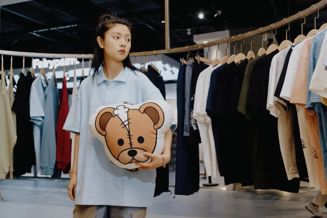 Q:先简单介绍一下品牌吧 A:GAONCREW是上海本土潮牌,团队的核心人物也都是上海人。品牌全称是”GATHERING ALL OR NOTHING”,简称GAON在上海话里就是“犟”的意思,代表了一种宁缺毋滥、孤注一掷的生活态度。读一读我们的slogan就能理解品牌理念了——无视年龄,不分国界;源于市井,便是街头。GAONCREW的设计都源自于真实发生在中国街头的文化元素,最近这句话还被某国潮大牌原封不动“借鉴”过去了,您好版权费麻烦这边结一下。Q:厉害厉害,那今天的OUTFIT有什么亮点吗?A:今天穿的是我们本季的最新款,也是夏季主推款小熊带钻T恤,是春季小熊系列爆款的延续,这也是店里唯一一款带钻单品,非常独特。配饰是用三环戒指做成的项链,用戒指作项链也是现在比较流行的趋势。说到项链,我们品牌还是第一个用口风琴做项链的品牌,一经推出就成为了19年的爆款单品。Q:好闪亮好喜欢!工作中还有什么让你大呼好喜欢的事情吗?A:有!你也知道我们家rapper太多了,所以经常举办活动和party,GALI、永彬都是老板的朋友,现场真的帅拉了!我们还会经常跟rapper进行联名合作,大家可以多多关注。Q:刚刚有提到品牌风格比较偏街头,有没有帮助风格塑造的小Tips?A:一些牛仔的单品和元素有助于打造更嘻哈和街头的look,比如我们家的牛仔夹克和牛仔裤。牛仔一直是最具有街头代表性的单品之一,我们则在其中加入了更具品牌代表性的元素,例如腰果花啦(腰果花Triple Kill!)、拼接啦,还有一些Oversize的版型。Q:店里单品均价大概在多少?A:短袖在100+,裤子200-300,每个月都有折扣活动,折后均价会在100-200左右。