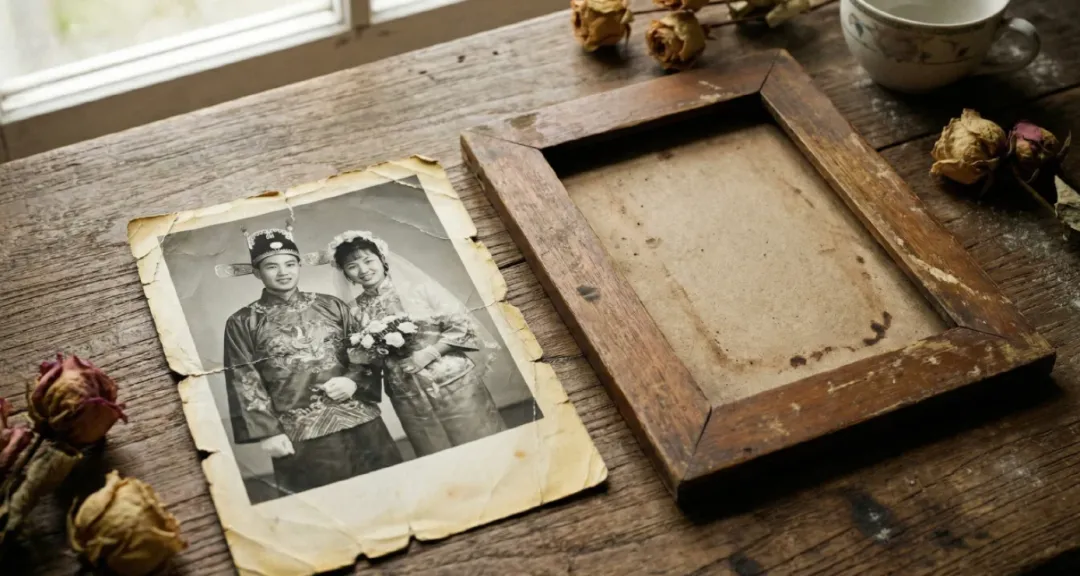 照片里,我爸穿着蓝色中山装,我妈穿着红色嫁衣,站在一个很土的照相馆背景板前。两个人表情僵硬,但眼神里有光。