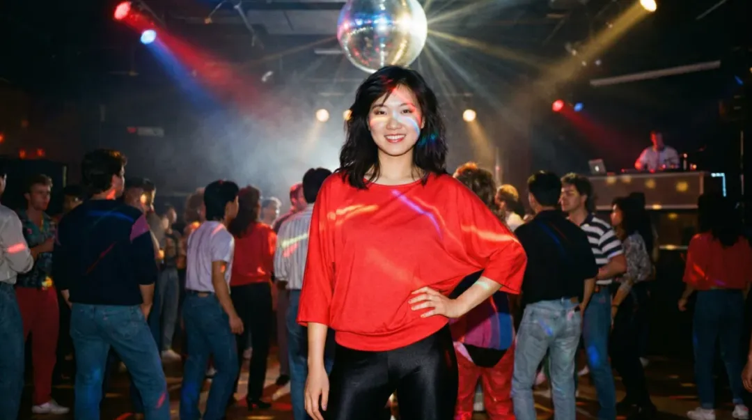 我穿着一件红色蝙蝠衫,黑色健美裤,白色运动鞋。头发烫了(假的),戴着大耳环。站在灯球下面,一只手叉腰,另一只手指着天花板。