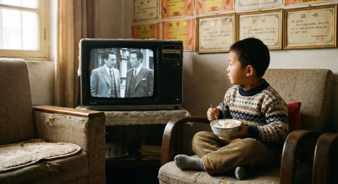我用AI生成了那个场景:一间老式客厅,水泥地、木桌、搪瓷茶缸、墙上挂着奖状。电视机是那种带天线的老式方块。屏幕里放着《上海滩》的片头。