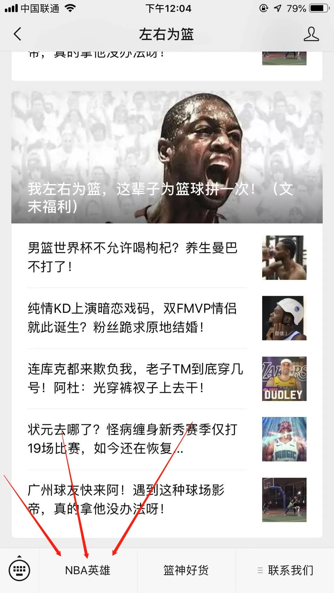 1、进入我的公众号主页,点击菜单栏”NBA英雄“。