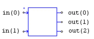 所有输入和输出都是 double 数据类型。 输入值存储在“in”数组中,输出值存储在“out”数组中。 C模块的输入/输出节点序列是从顶部到底部。 例如,对于具有2个输入和3个输出的模块,节点分配为: