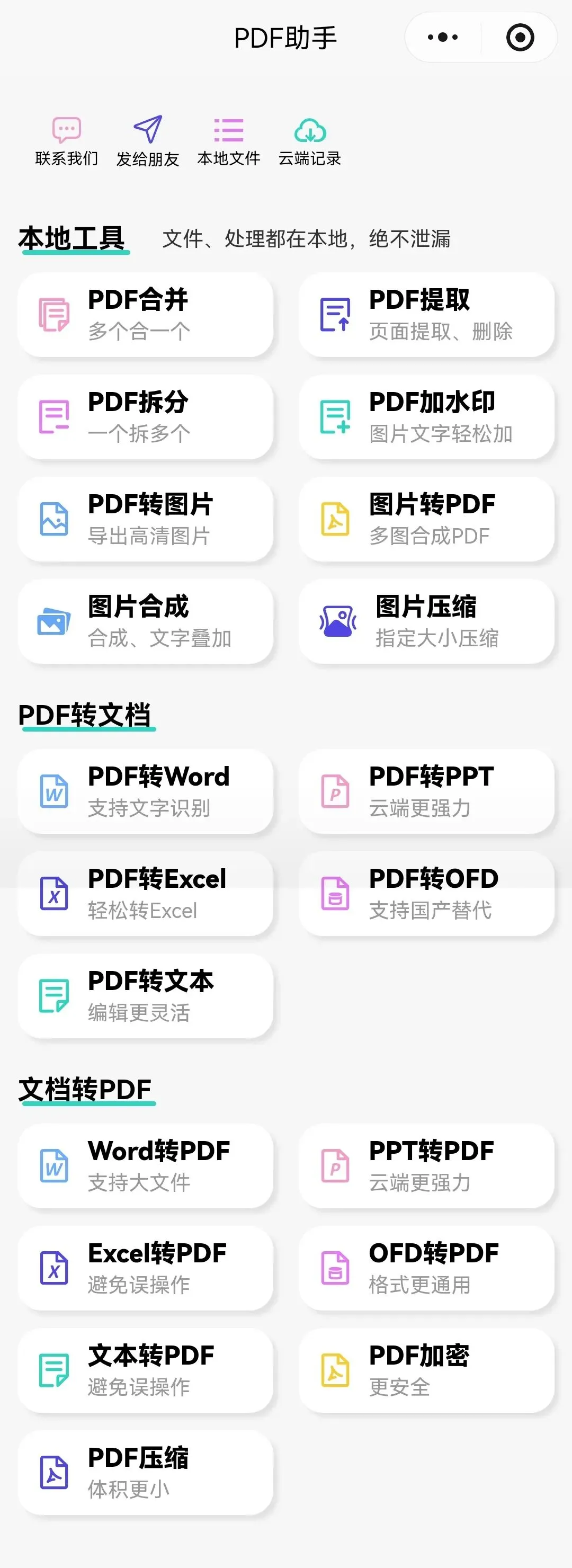 这款小程序的功能强大到超乎想象,界面却非常简洁。它把PDF的“输入”和“输出”需求都考虑全了: