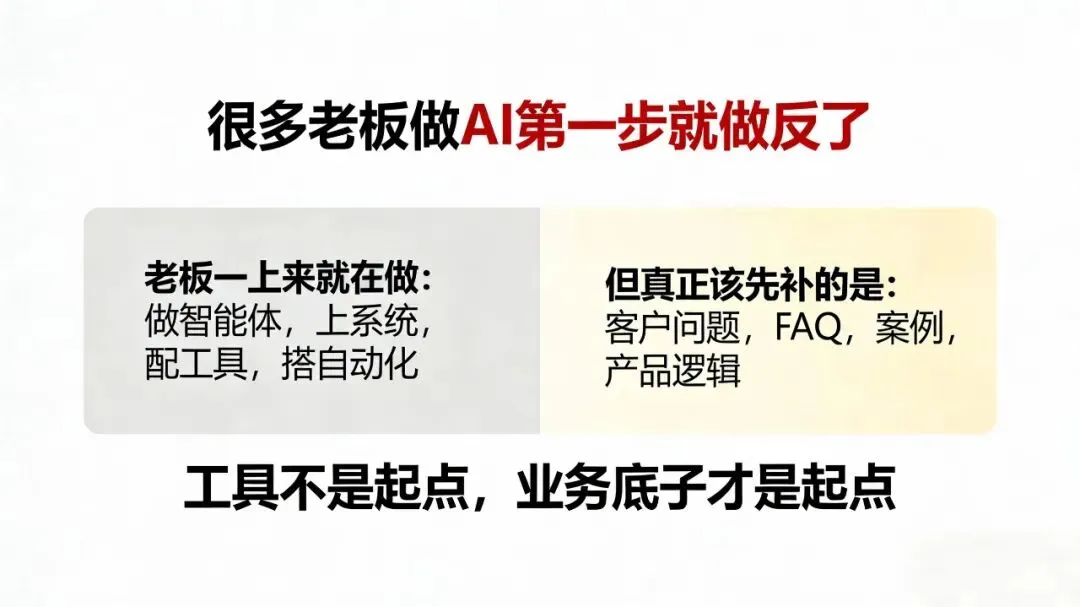 而是很多老板做AI,第一步就做错了。