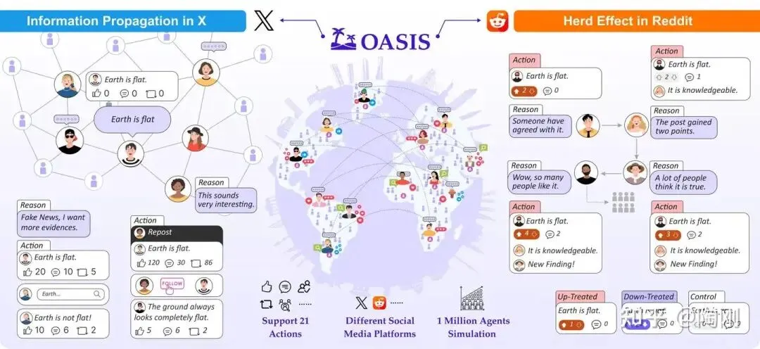OASIS 支持最多 100 万智能体交互和 23 种社交行为——关注、发帖、评论、转发、引用、点赞等。推荐系统使用 TwHIN-BERT 进行内容排序,兼顾兴趣匹配和热度排名。