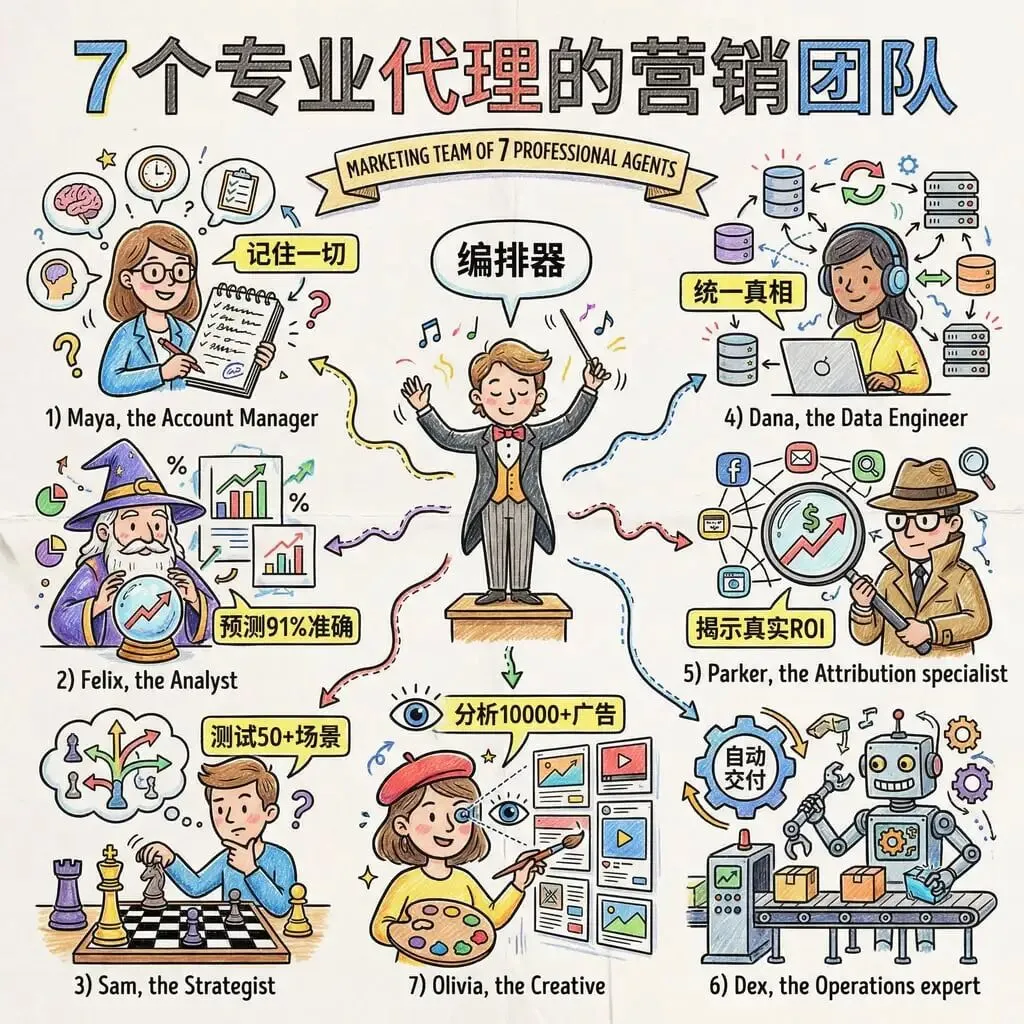 我没有构建一个巨型AI,而是构建了一个团队。每个代理有特定角色、特定工具和特定个性,反映真实营销专家的思维方式。