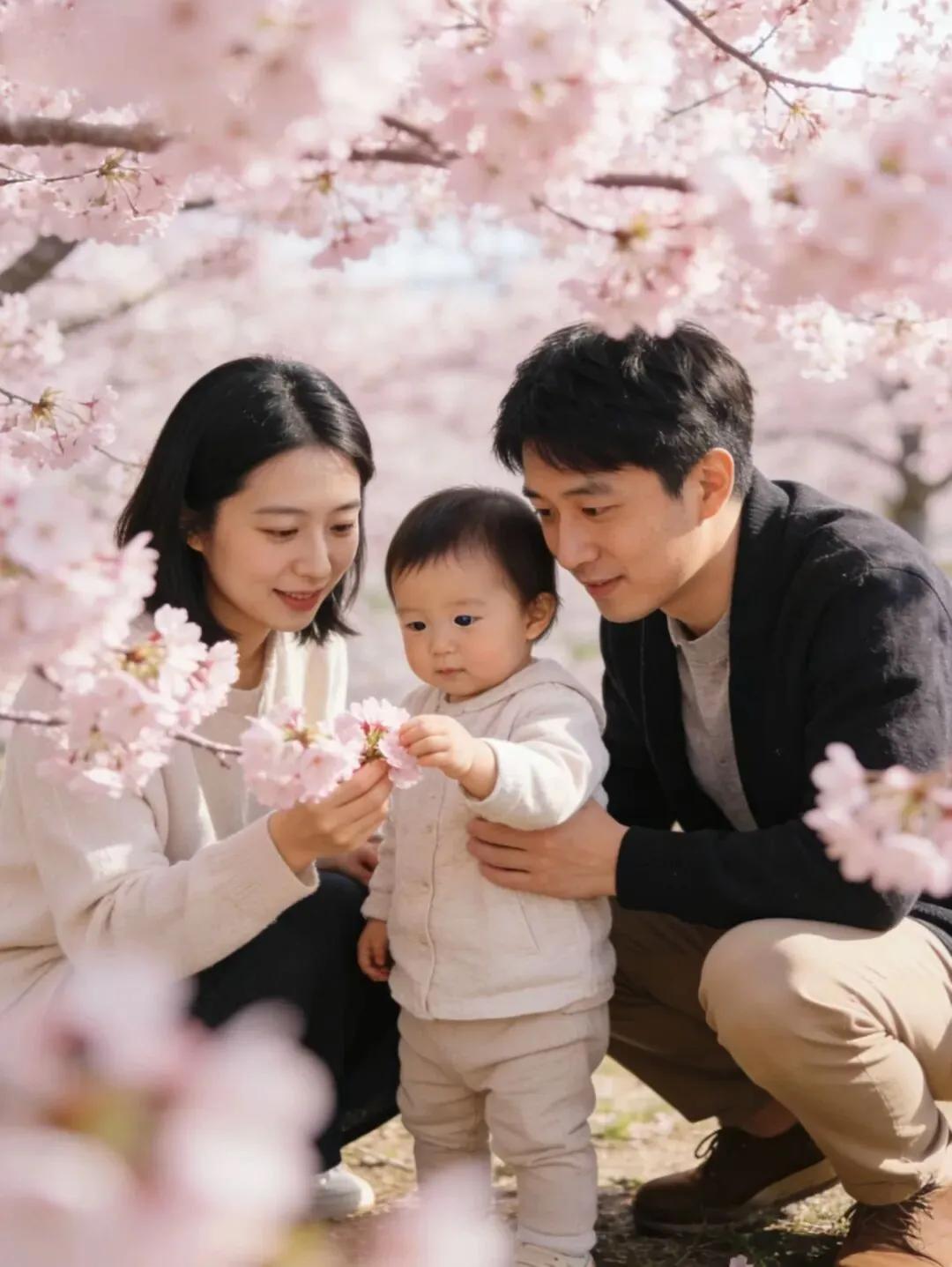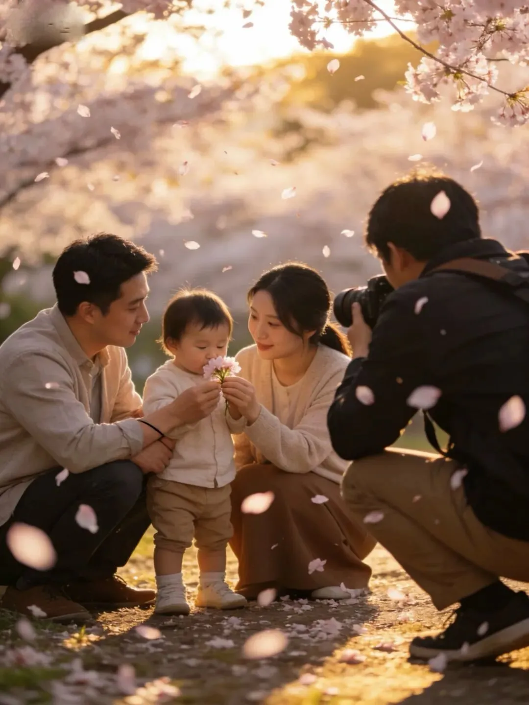 一家人的视线都集中在同一朵花上,创造故事感