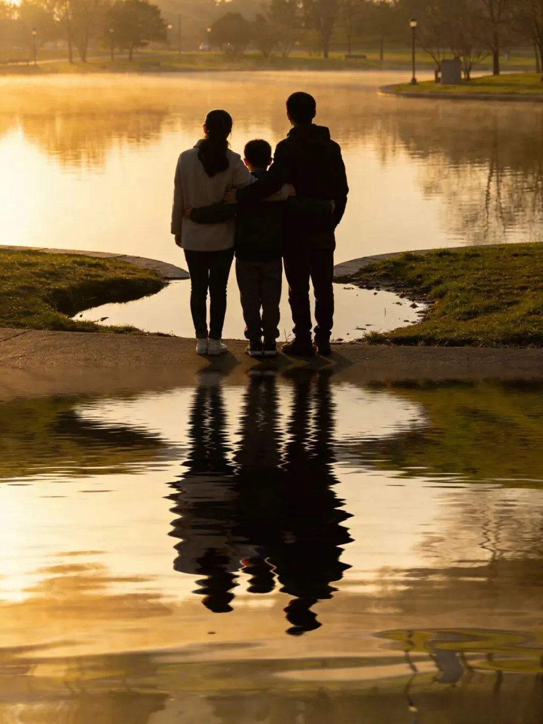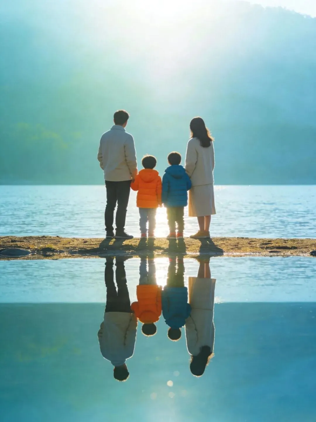 选择水面平静的区域,一家人站在水边