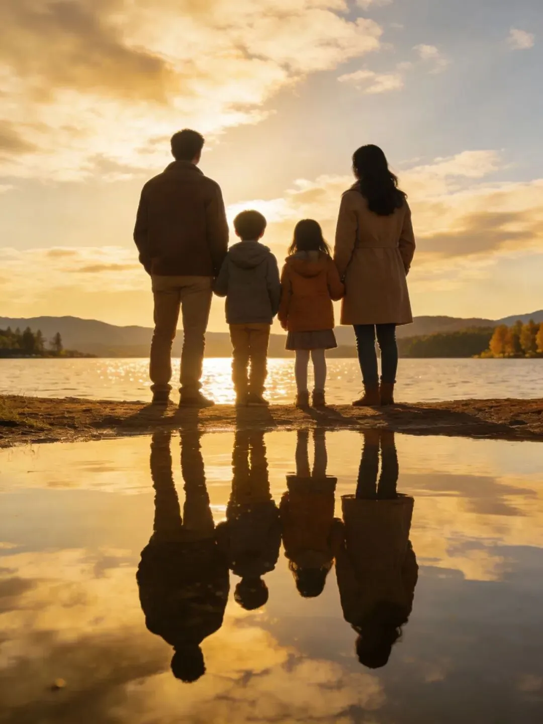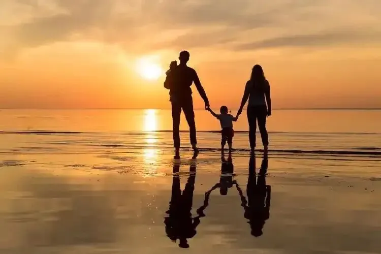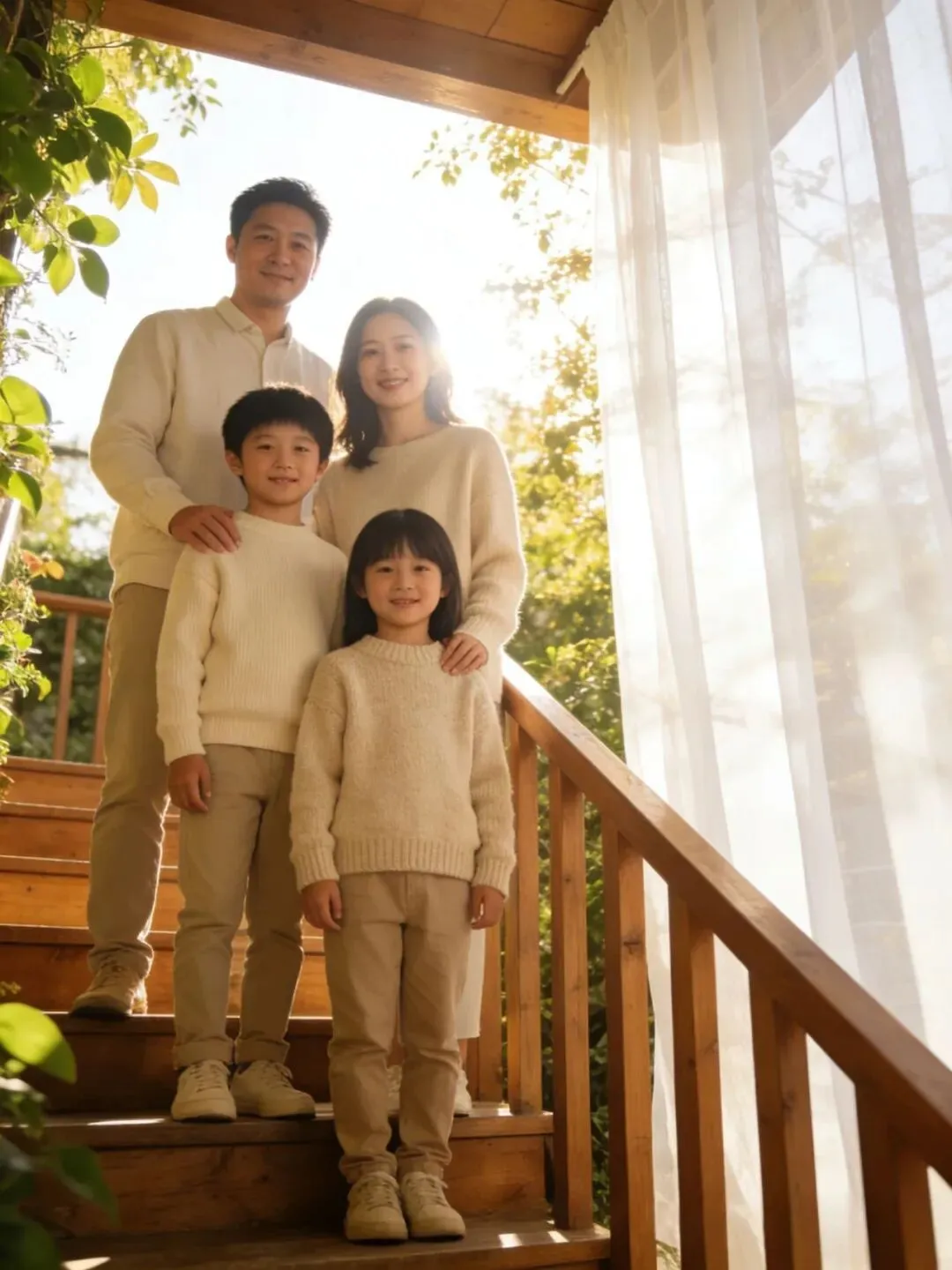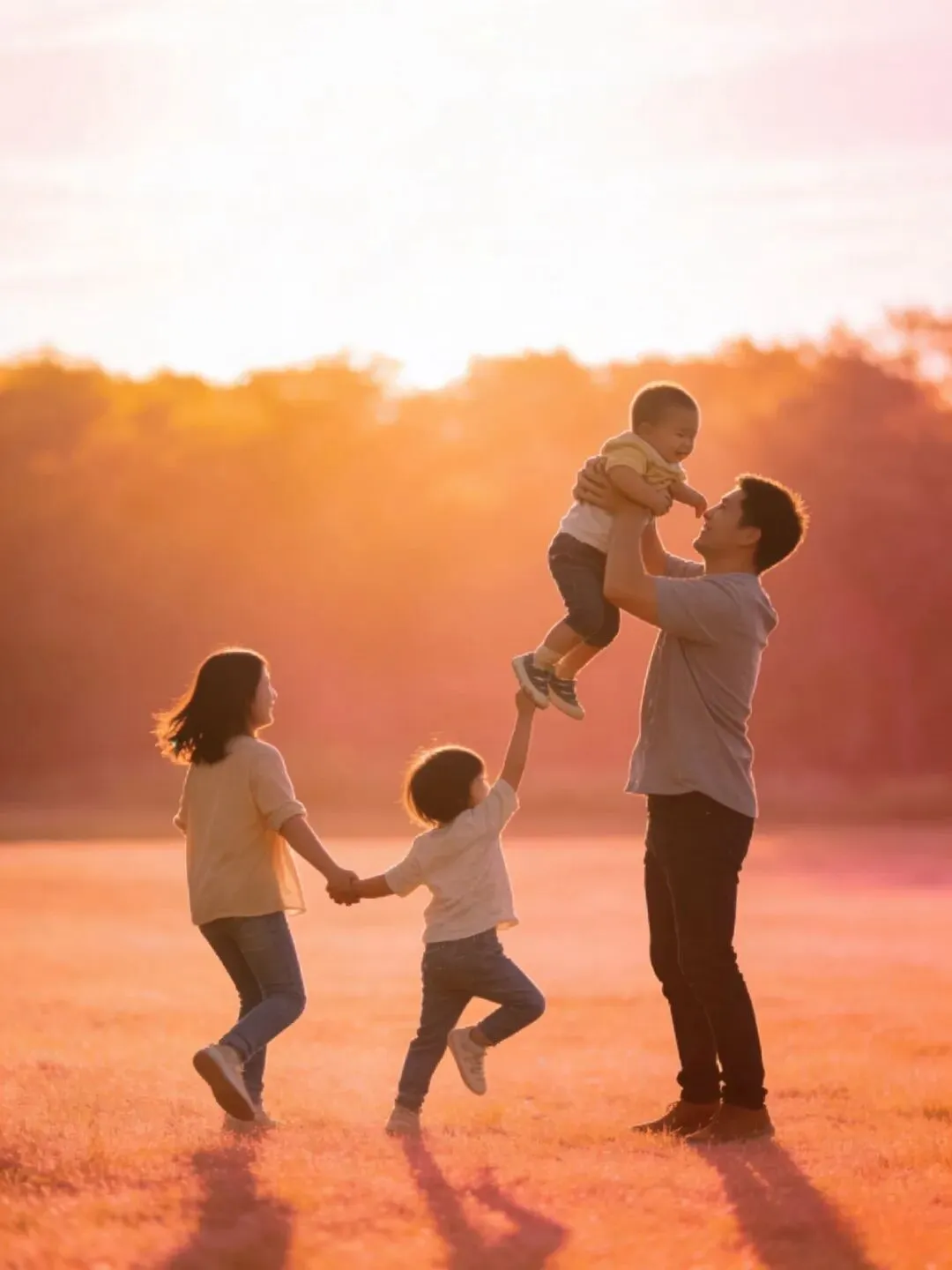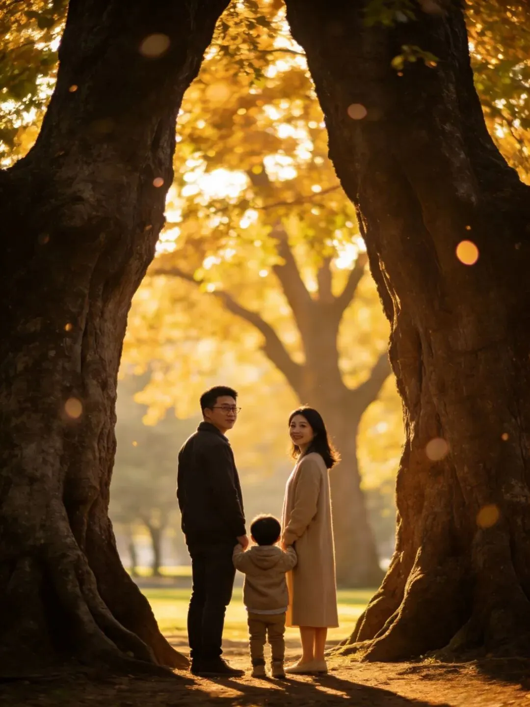 构图:使用三分法,将家庭放在右侧或左侧交叉点