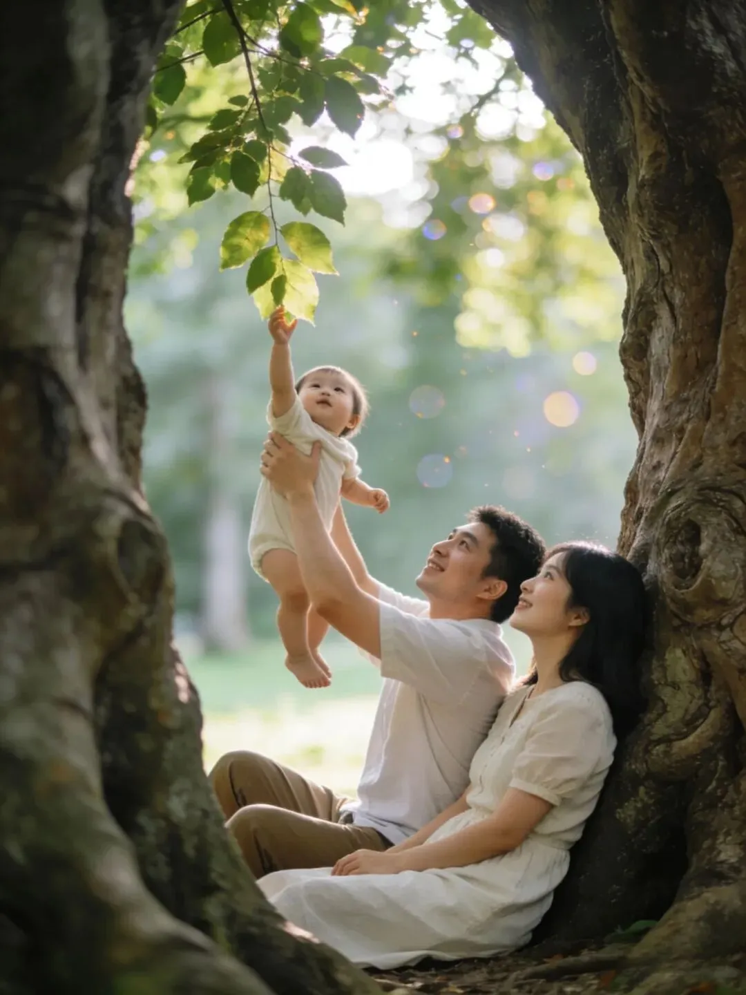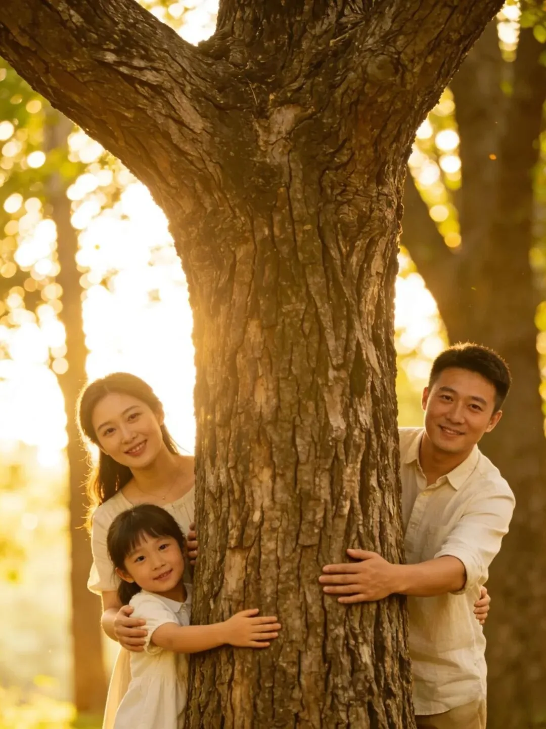 一家人环抱树干,或背靠树干坐在地上