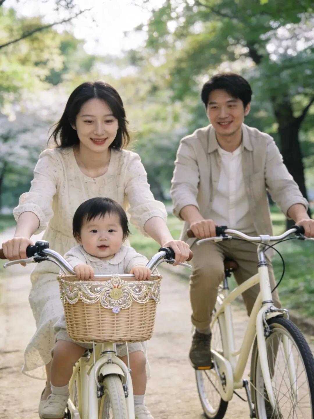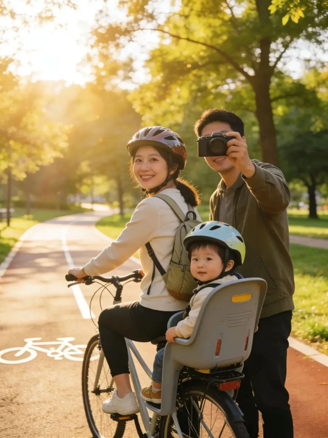 爸爸或妈妈骑车载着宝宝,另一人并行或拍摄