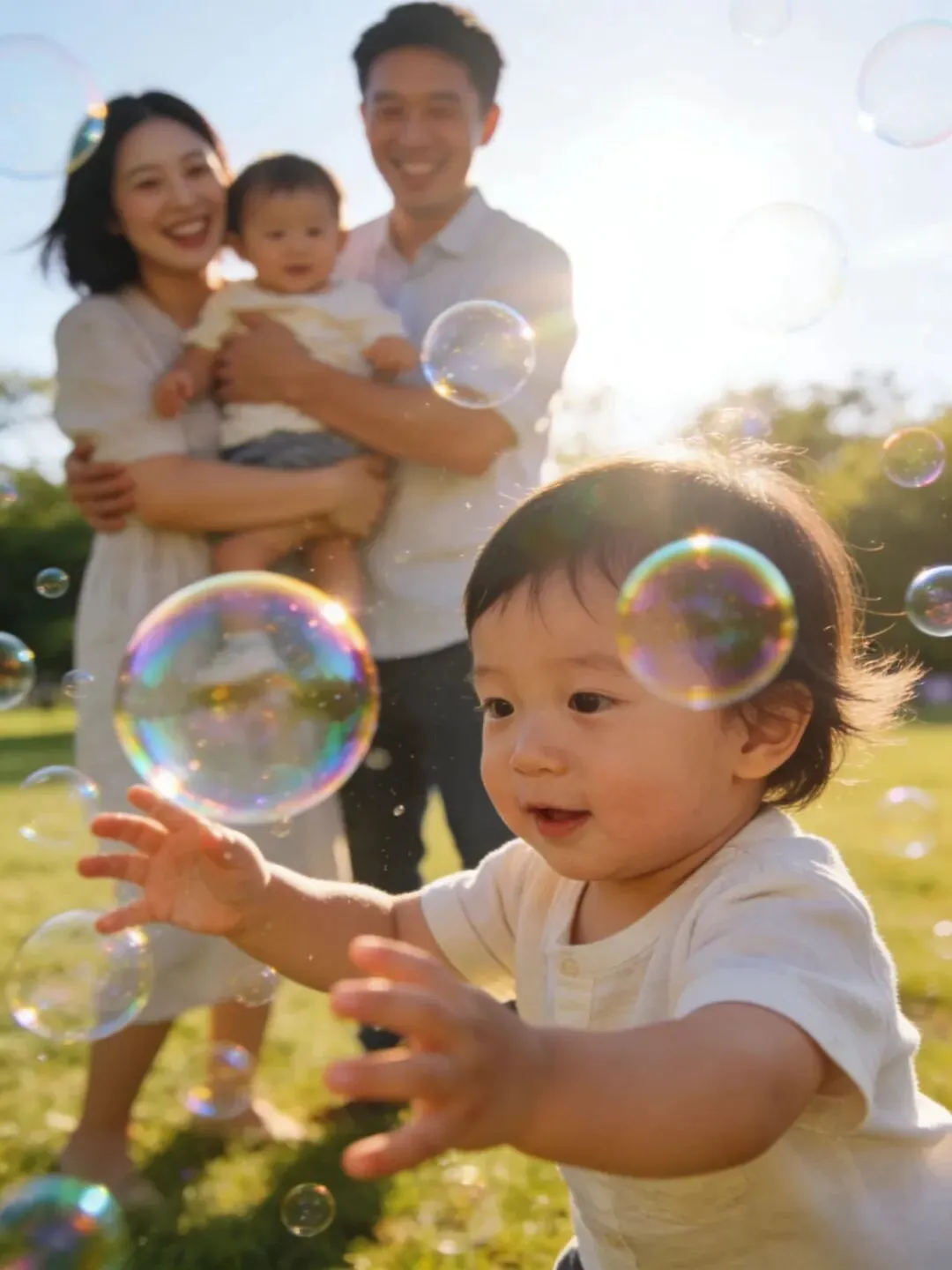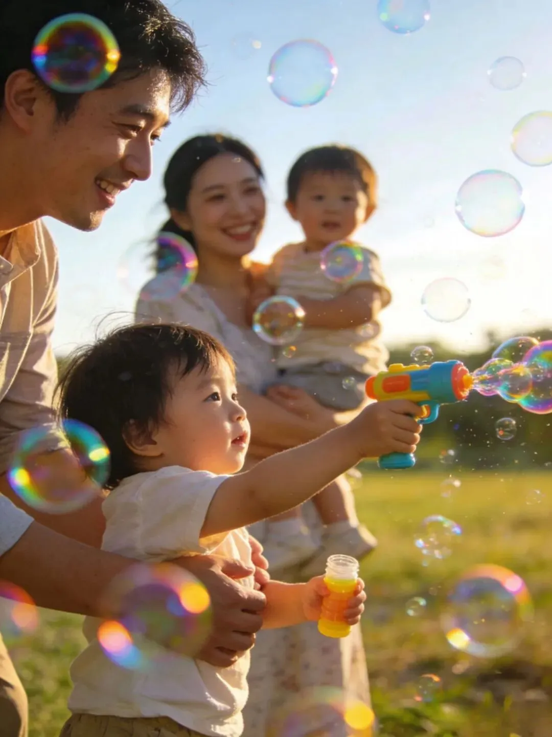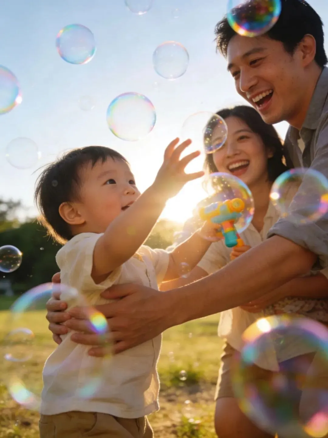 一家人在泡泡中拥抱、欢笑