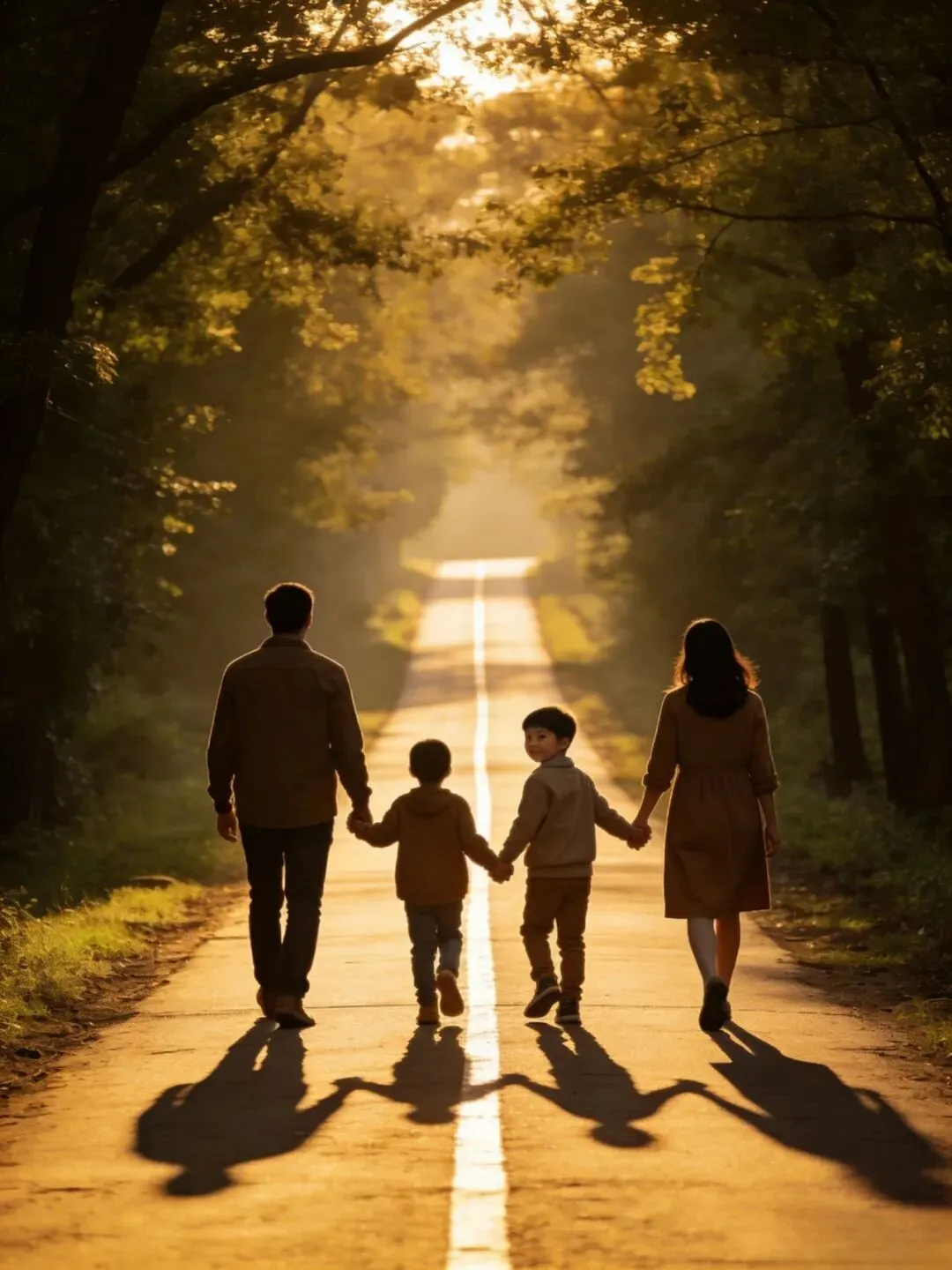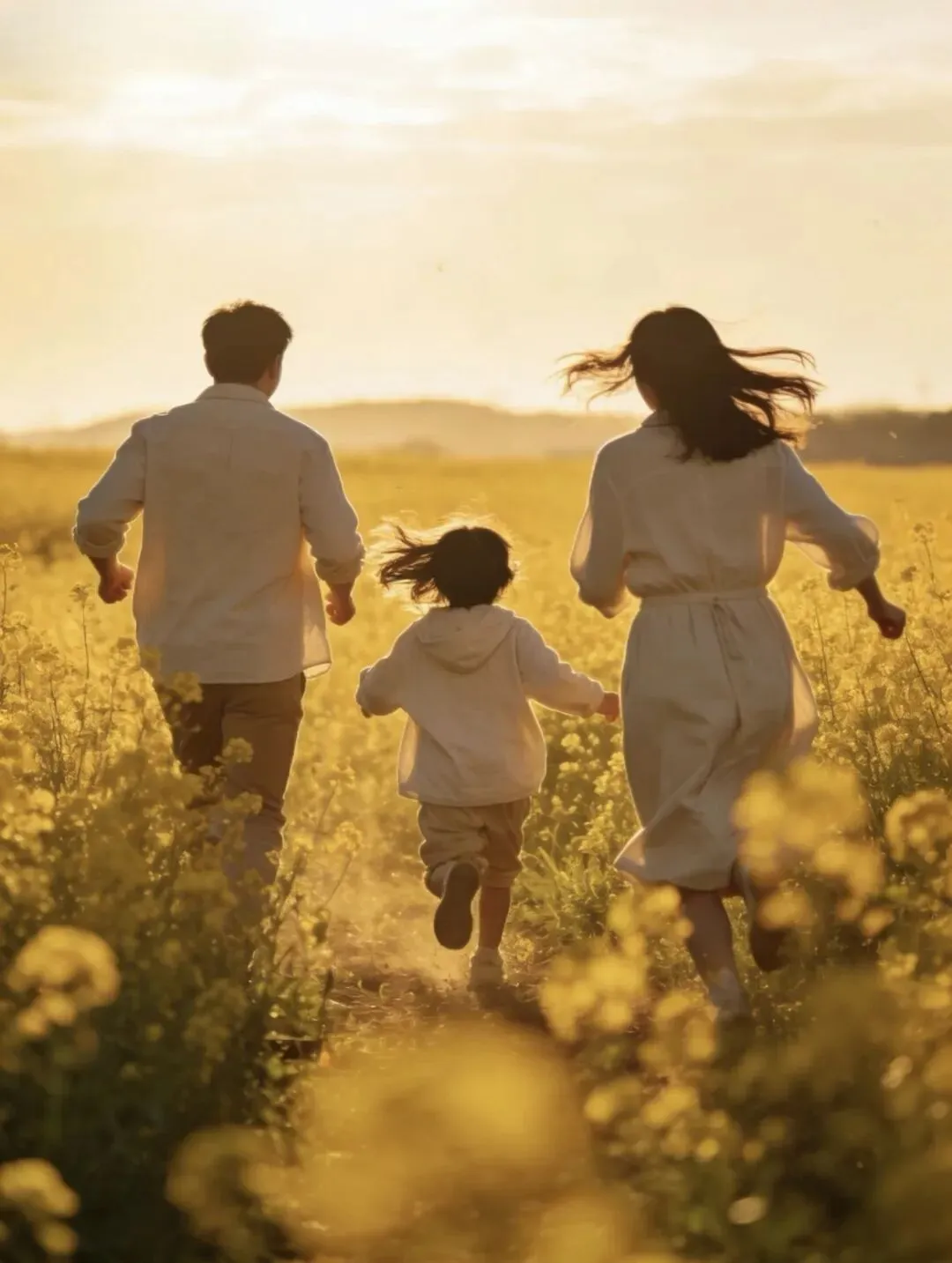 一家人背对镜头,手牵手向前走