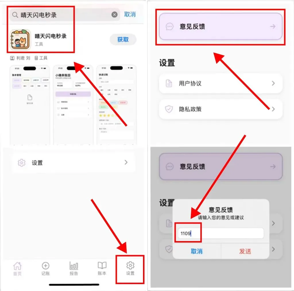 伪装解锁:搜索"晴天闪电秒录",允许该软件的网络权限,进入软件首页,点击底部右下角的“设置”,再点击“意见反馈”页面的输入框中,输入“1109”,点击“发送”,退出软件,并清理掉软件后台,重启软件即可使用。