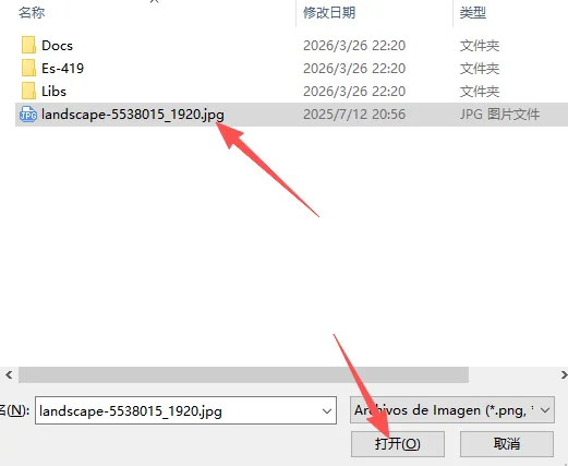 在文件选择窗口中选中目标图片,点击“打开”