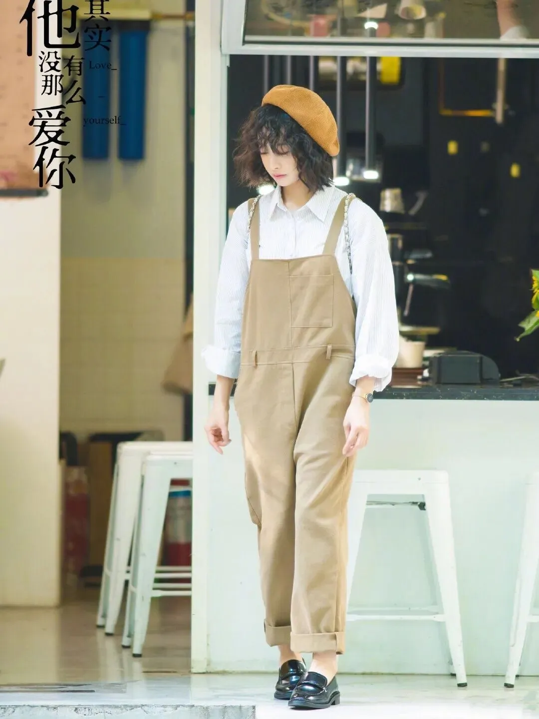 新剧里的造型大家初秋时节可以照着穿哦,减龄背带裤搭配白衬衫和羊毛卷,戴上一顶贝雷帽,青春活力又有邻家姐姐的亲切感。