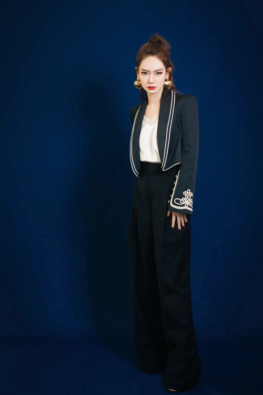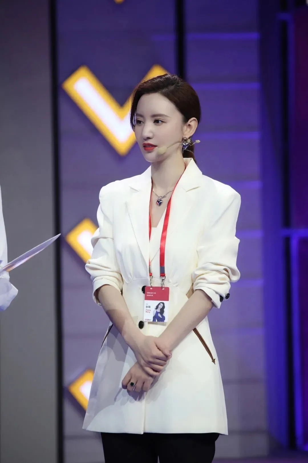 参加节目时,则选择了紧身款的西装外套搭配黑色西裤,简约的同时展现女强人气质,收腰设计展现纤细腰身。