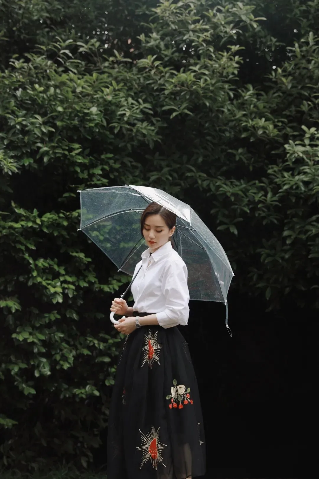 初秋季节不知道该怎么穿,也可以和刘诗诗一样,白衬衫搭配黑色刺绣长裙,既能展现时髦的摩登气质,同时又做好了保暖工作。